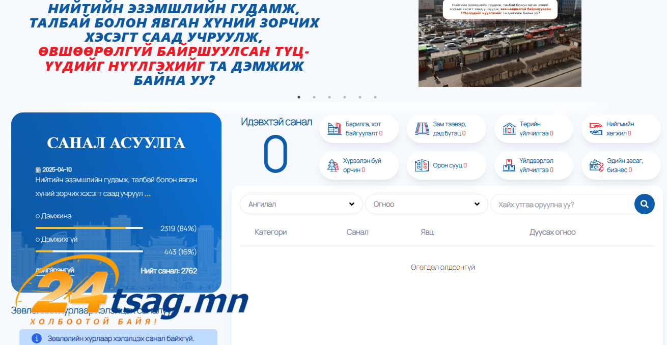 Санал асуулга дөрөвдүгээр сарын 10-17-ны өдрүүдийг дуустал буюу долоо хоног үргэлжилнэ. Иргэд та бүхнийг санал асуулгад идэвхтэй оролцохыг уриалж байна. Та бүхэн доорх линкээр санал асуулгад оролцоно уу.