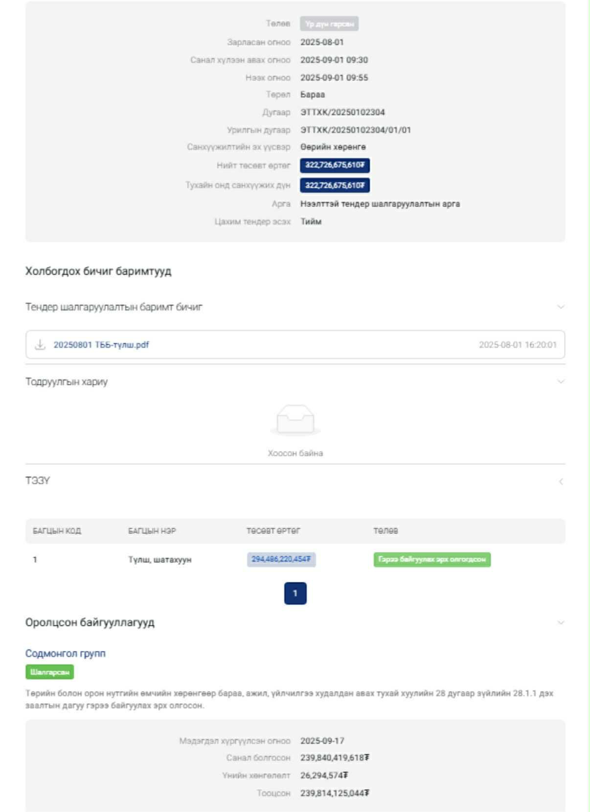 Үүнээс 11 хоногийн дараа буюу наймдугаар сарын 1-нд “Эрдэнэс тавантолгой” ХК-аас Түлш, шатахуун худалдаж авах 322 тэрбум төгрөгийн тендер зарласан. Улмаар есдүгээр сарын 17-нд Ц.Анандбазарын “Содмонгол групп” ХХК-ийг шалгаруулсан байна. Ингэхдээ “Шунхлай” болон “Петровис”-ийн харьяа “НИК”-ийг “Өндөр үнийн санал өгсөн” шалтгаанаар хасаж, харин Ц.Анандбазарыг “Содмонгол групп”-ыг шалгаруулан гэрээ байгуулахаар болжээ. Энэхүү 322 тэрбум төгрөгийн тендер нь Ц.Анандбазарын “Содмонгол групп” ХХК-ийн байгуулагдсанаасаа хойш оролцсон, шалгарсан хамгийн том тендер болж байна. Мөн “Эрдэнэс тавантолгой” ХК-ийн тухайд байгуулагдсанаасаа хойш анх удаа ийм өндөр төсвөөр буюу 322 тэрбум төгрөгөөр Түлш, шатахуун авах тендер зарласан нь энэ болж байна.