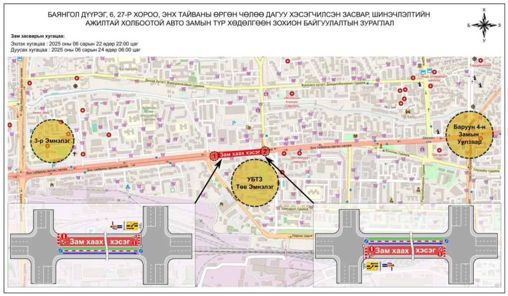 Зам хаах: 6 дугаар сарын 22-ны 22:00 цаг - Зам нээх: 6 дугаар сарын 24-ний 06:00 цаг