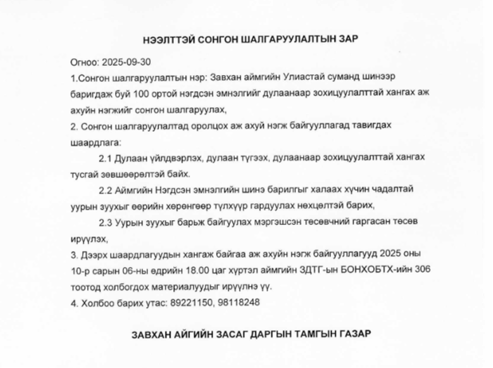Нээлттэй сонгон шалгаруулалтын зар