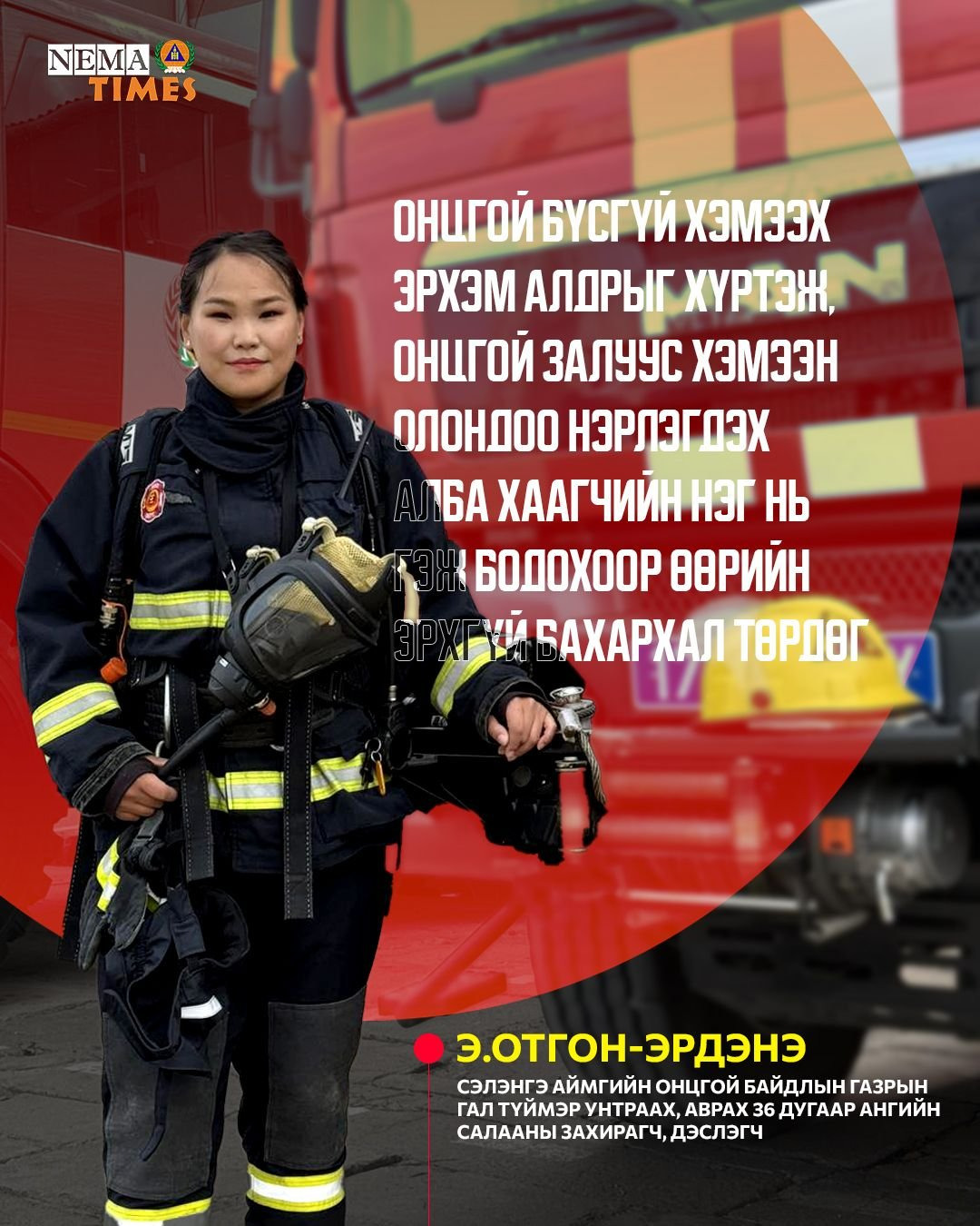 Энгийн бүхэн бусдын хайрыг татаж, өөрийн эрхгүй хүндлэх мэдрэмжийг төрүүлдэг. Өөрийнхөөрөө, нээлттэй, харилцаа хандлага нь зөв нэгэнтэй уулзах төдийд л “соронз” мэт татагддаг нь хүмүүн бидний харилцааны эхлэл байх. Түймрийн голомтод үүрэг гүйцэтгээд явж байсан олон залуусаас түүний нүд хамгийн ихээр сэтгэл татсан юм. Түүнийг дэслэгч Э.Отгон-Эрдэнэ гэдэг. Тэрбээр Сэлэнгэ аймгийн Онцгой байдлын газрын Гал түймэр унтраах, аврах 36 дугаар ангид салааны захирагч албан тушаалыг хашиж байна. Аймагтаа анхдагчийн түүхийг үргэлжлүүлж яваа түүнийг энэ удаагийн “Nematimes” онцлон танилцуулж байна.