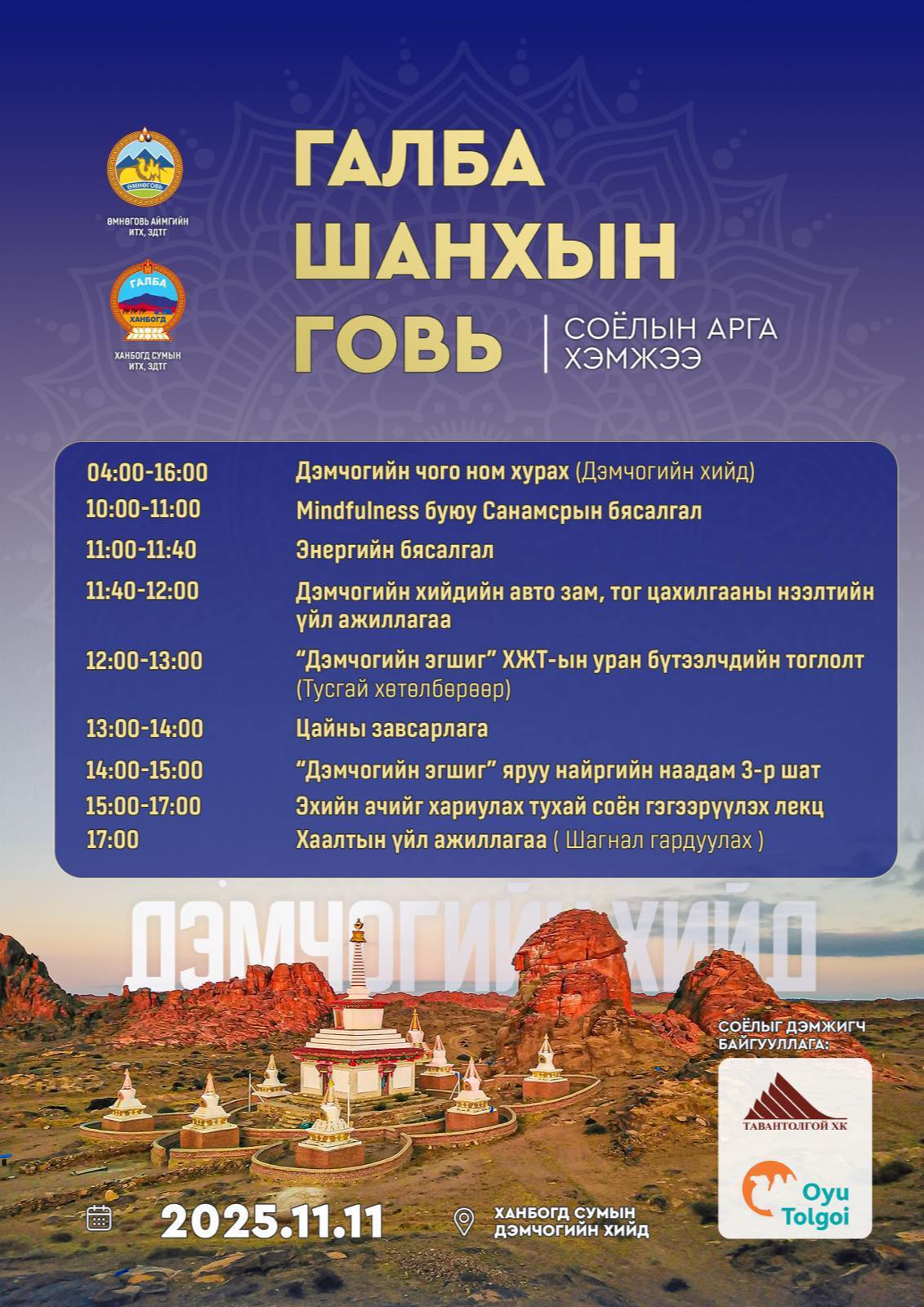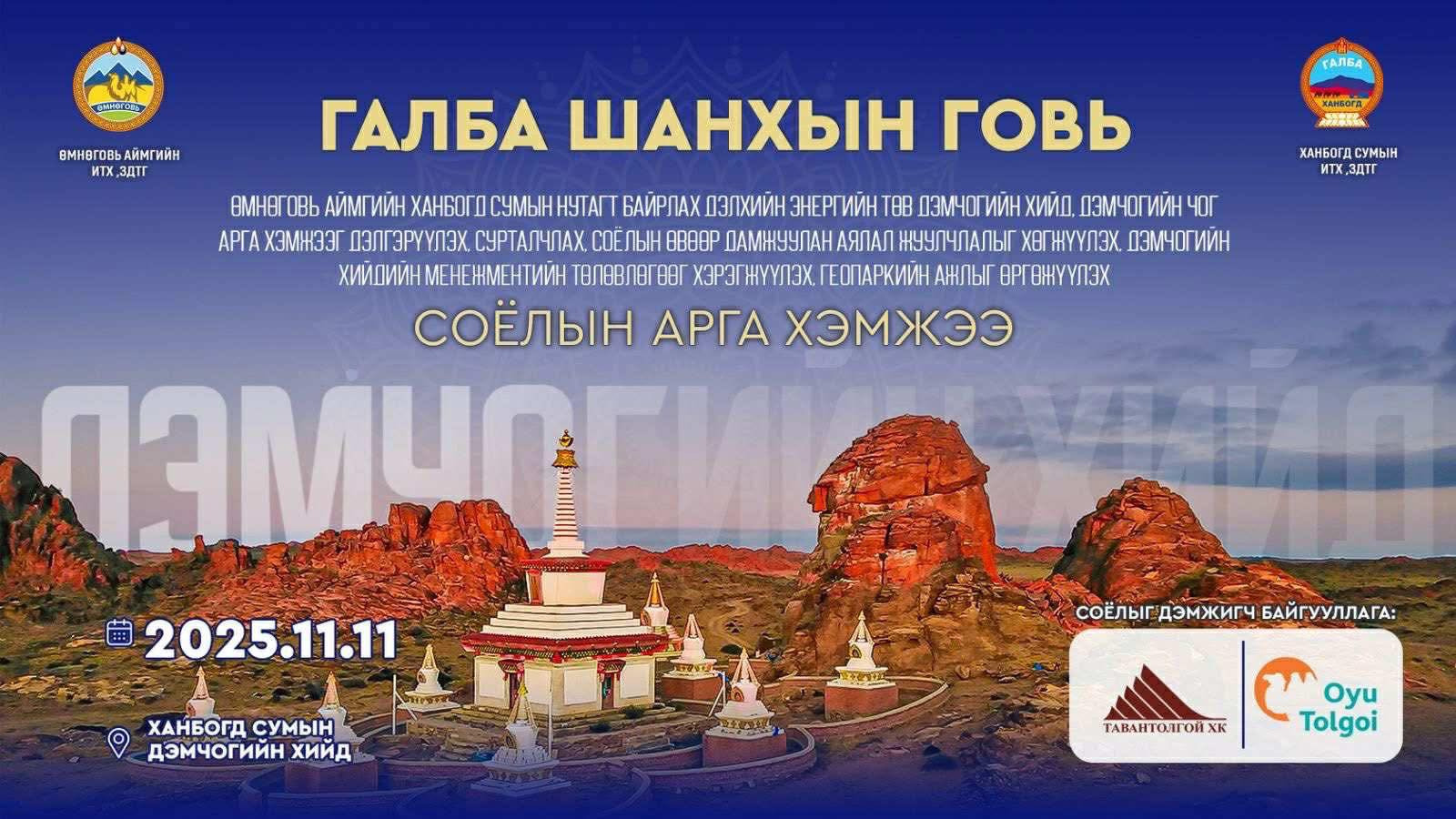 Өмнөговь аймгийн Ханбогд сумын нутагт байрлах Дэлхийн энергийн төв Дэмчогийн хийд болон “Дэмчогийн Чог” арга хэмжээг дэлгэрүүлэх, сурталчлах, соёлын өвөөр дамжуулан аялал жуулчлалыг хөгжүүлэх, мөн Дэмчогийн хийдийн менежментийн төлөвлөгөөг хэрэгжүүлэх, геопаркийн үйл ажиллагааг өргөжүүлэх зорилгоор 2025 оны 11 дүгээр сарын 11-ний өдөр Ханбогд сумын Дэмчогийн хийдэд “ГАЛБА ШАНХЫН ГОВЬ” соёлын арга хэмжээ зохион байгуулагдана.
