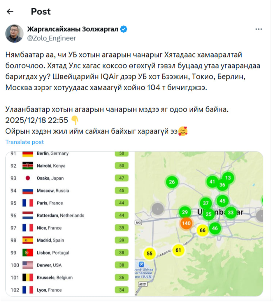 Тэрээр, “Нямбаатар аа, чи УБ хотын агаарын чанарыг Хятадаас хамааралтай болгочлоо. Хятад Улс хагас коксоо өгөхгүй гэвэл буцаад утаа угаарандаа баригдах уу? Швейцарын IQAir дээр УБ хот Бээжин, Токио, Берлин, Москва зэрэг хотуудаас хамаагүй хойно 104-т бичигджээ. Улаанбаатар хотын агаарын чанарын мэдээ яг одоо ийм байна. 2025/12/18 22:55