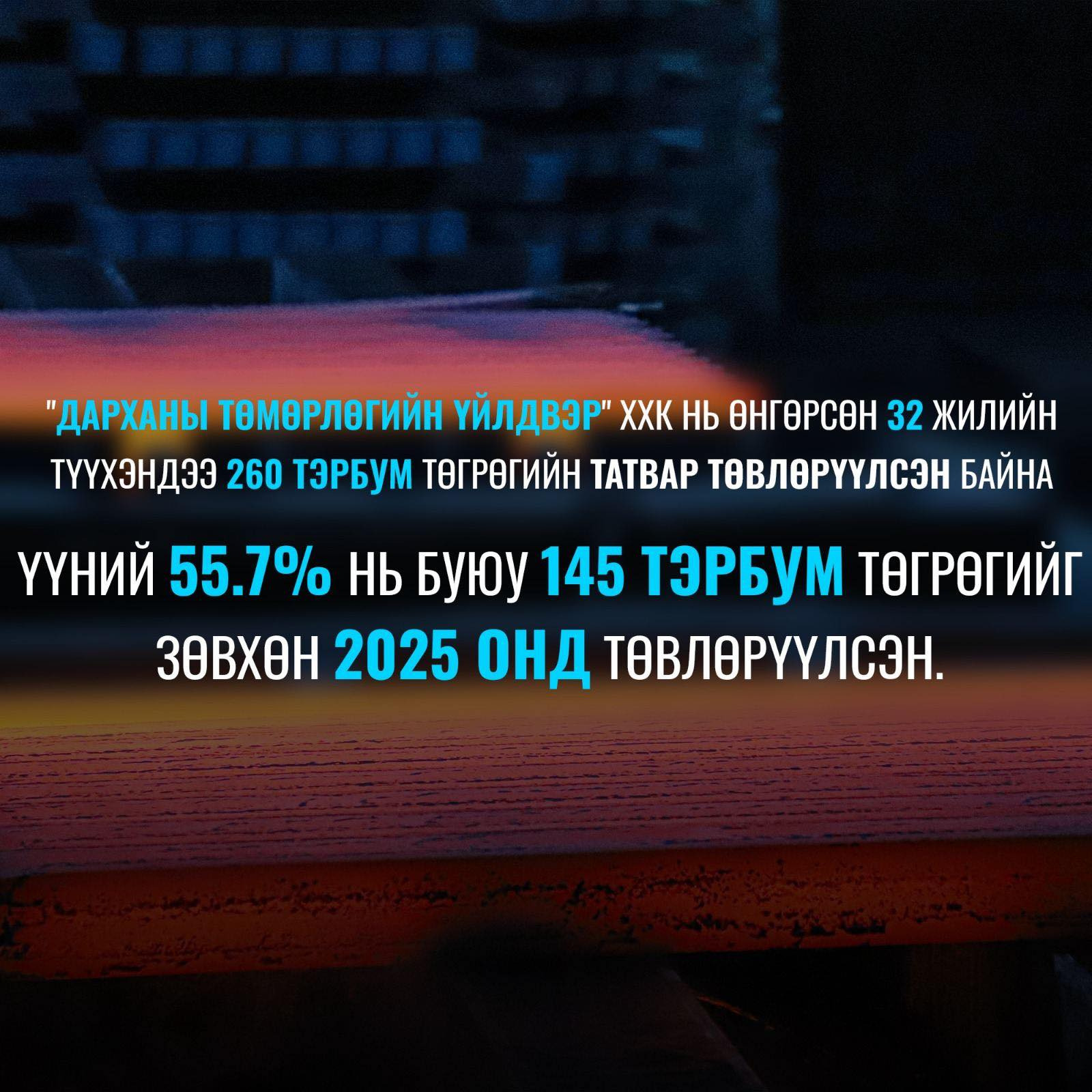 “Дарханы төмөрлөгийн үйлдвэр” ХХК үйл ажиллагаа явуулсан 32 жилийн хугацаанд улсын төсөвт нийт 267.8 тэрбум төгрөг төвлөрүүлснээс сүүлийн 1.5 жилийн хугацаанд 144.8 тэрбум төгрөг, буюу нийт дүнгийн 54 хувийг бүрдүүлсэн нь түүхэн төрийн өмчит үндэсний компанид оновчтой бодлого, зөв менежмент хэрэгжсэнээр ашигтай, тогтвортой ажиллах бүрэн боломжтойг харуулж байна.
