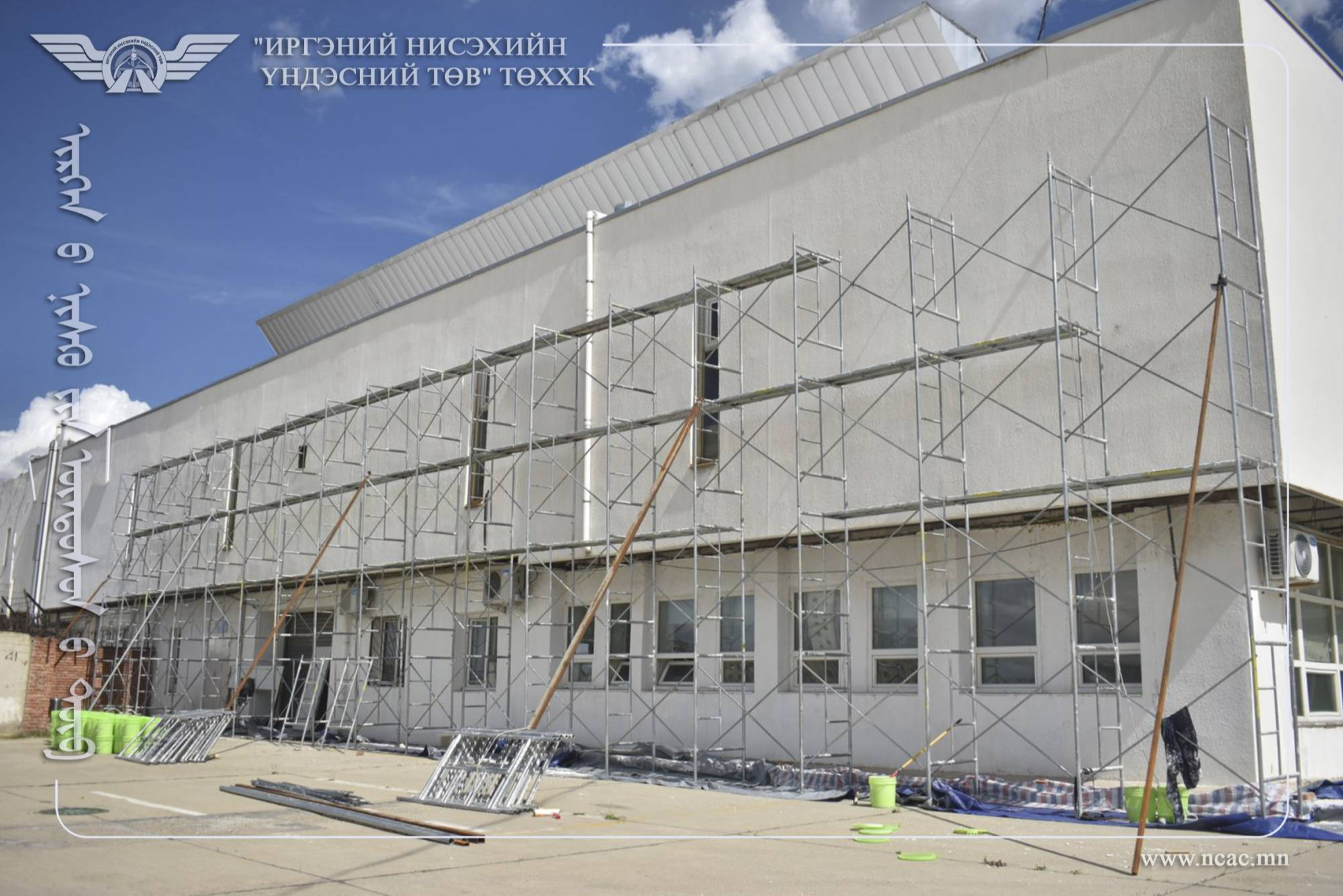 "Буянт-Ухаа" олон улсын нисэх буудлын гадна фасадны засварын ажлыг “БИ РИЧ ТРЕЙД” ХХК гэрээний дагуу 2025 оны 07 дугаар сарын 06-ны өдрөөс эхлэн зураг төслийн дагуу шинэчлэн засварлах ажил үргэлжилж байгаа ба дараах ажлуудыг хийж гүйцэтгэж байна.