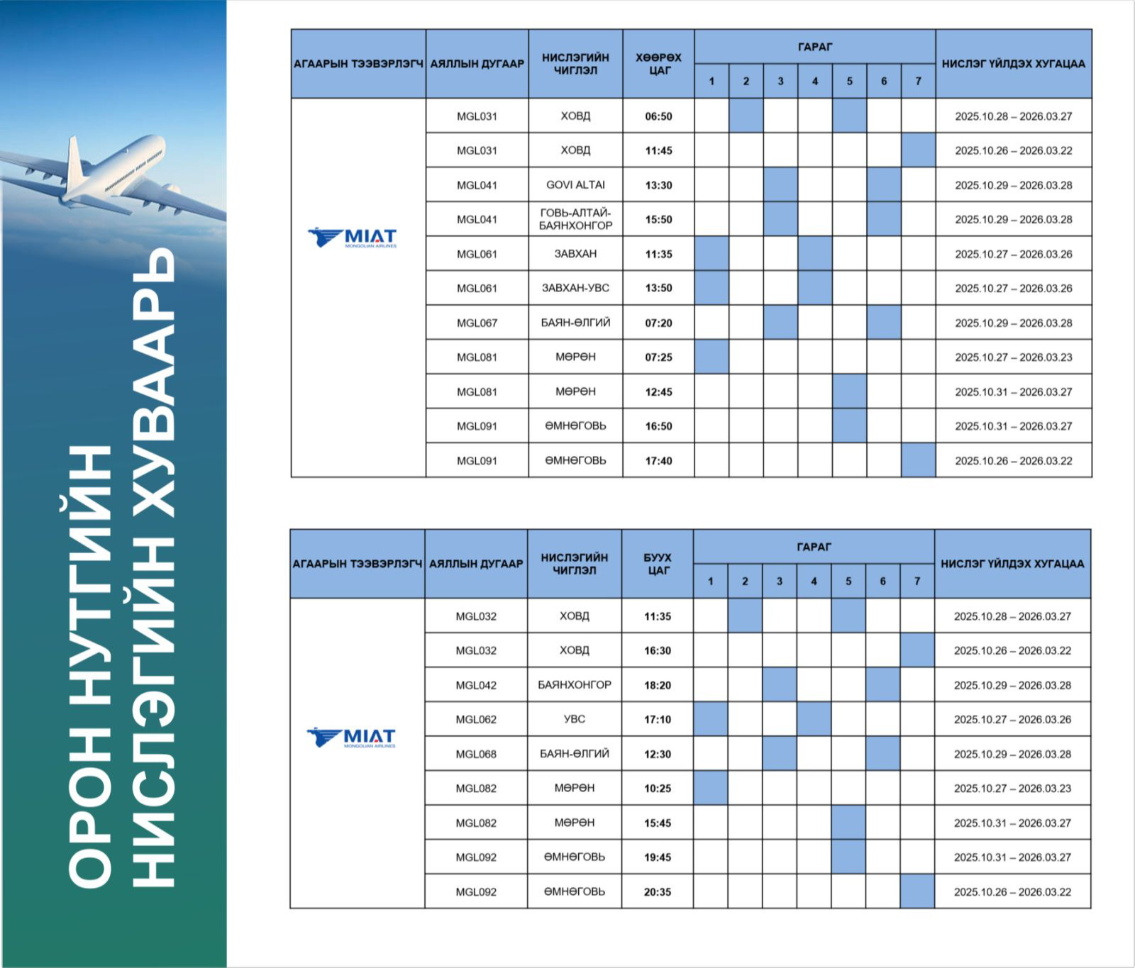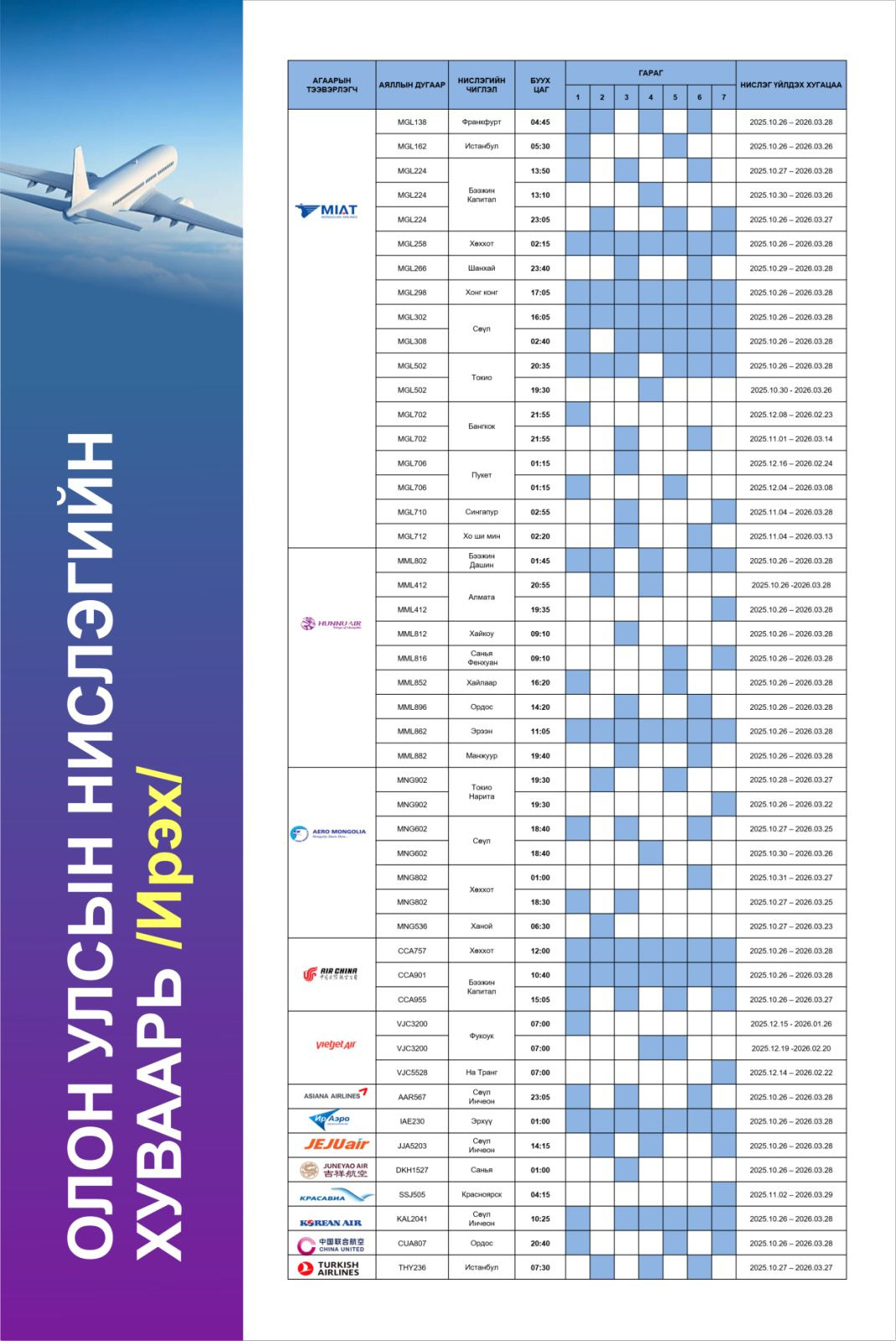 2025 оны олон улс болон орон нутгийн хуваарьт нислэгийн өвлийн цагийн хуваарь