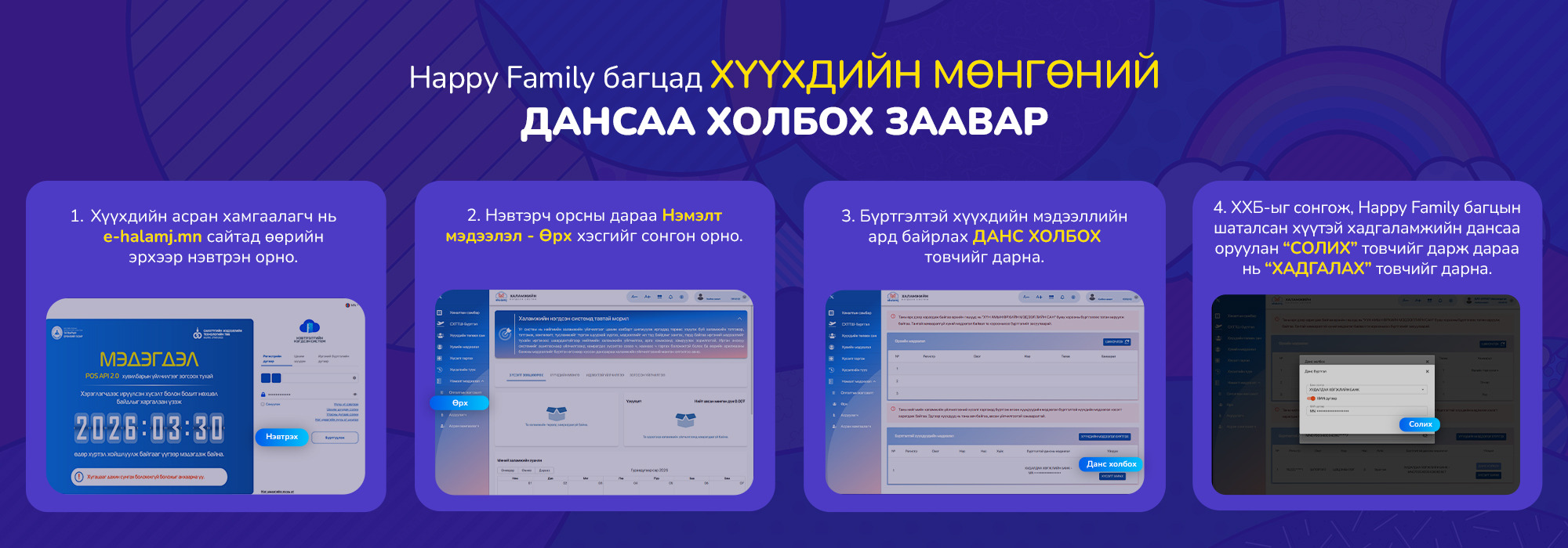 - Та e-halamj.mn сайт руу орж хүүхдийн 100,000₮-өө Happy Family багцынхаа өндөр хүүтэй хадгаламжийн данстай холбоорой. Ингээд л 2026.04 - 2026.09 сар хүртэл хүүхдийн 100,000₮-өө хадгалаад нэмэлт 100,000₮ урамшуулал авах юм. Урамшууллыг улирал бүрд хуваан олгоно.