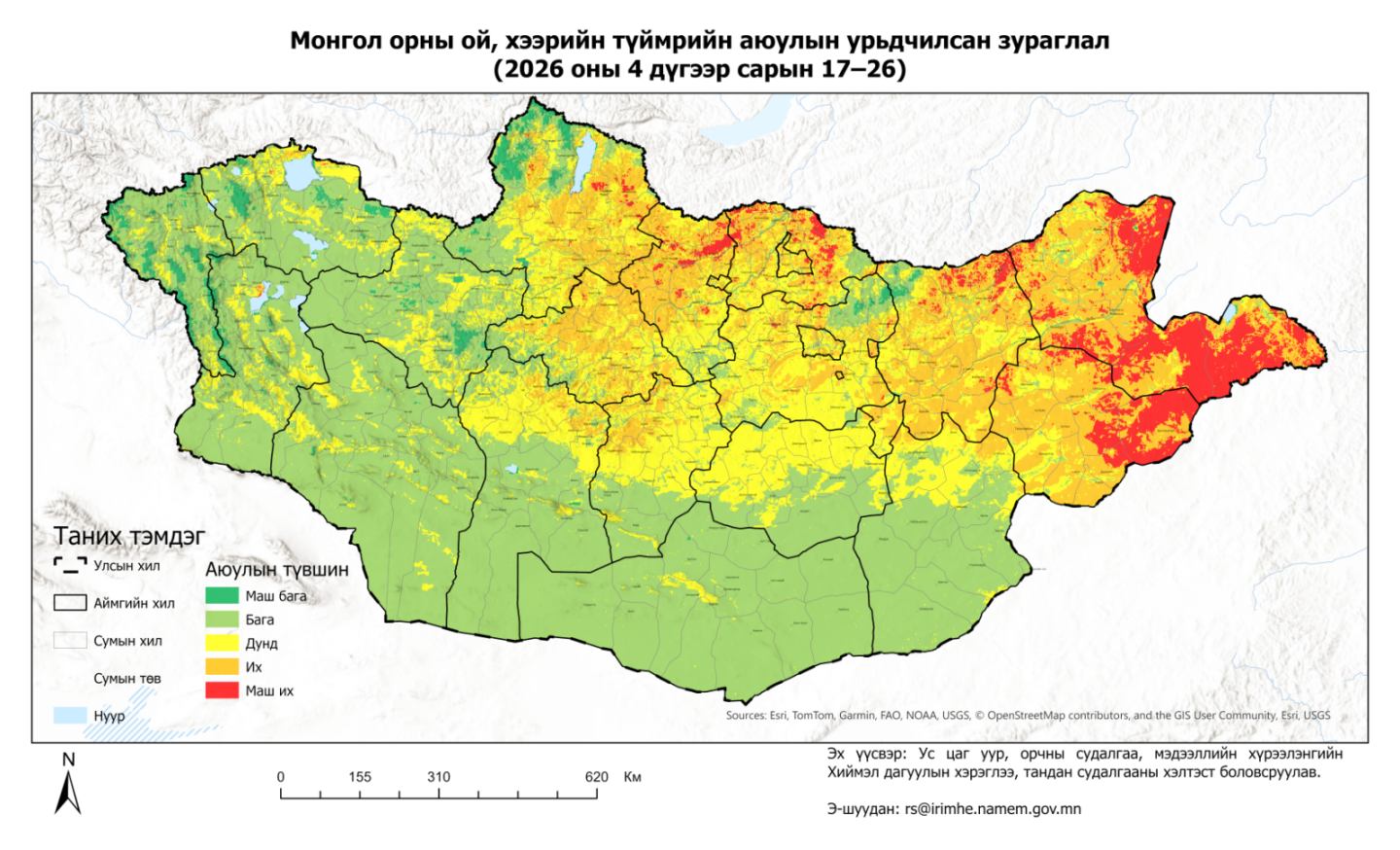 Ус цаг уур судалгаа, мэдээллийн хүрээлэнгээс дөрөвдүгээр сарын 17-26-ны өдрүүдэд нийт нутгаар ой, хээрийн түймэр гарах байгалийн нөхцөлийн урьдчилсан төлөвийг харуулсан аюулын зураглалыг туршилтаар боловсрууллаа.