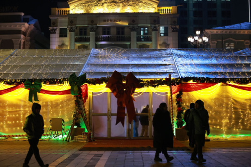 Фото сурвалжилга: Шинэ жилийн баярыг угтан Улсын Хүүхэд Залуучуудын театрын гадна талбайд мөсөн хотхон барьж байна