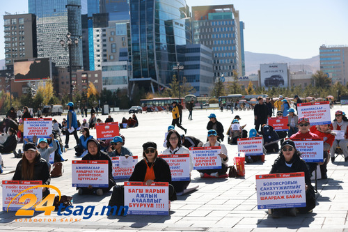 Боловсролын салбарын цалин хөлсийг нэмэгдүүлэхийг шаардсан багш нар Сүхбаатарын талбайд суулт хийлээ