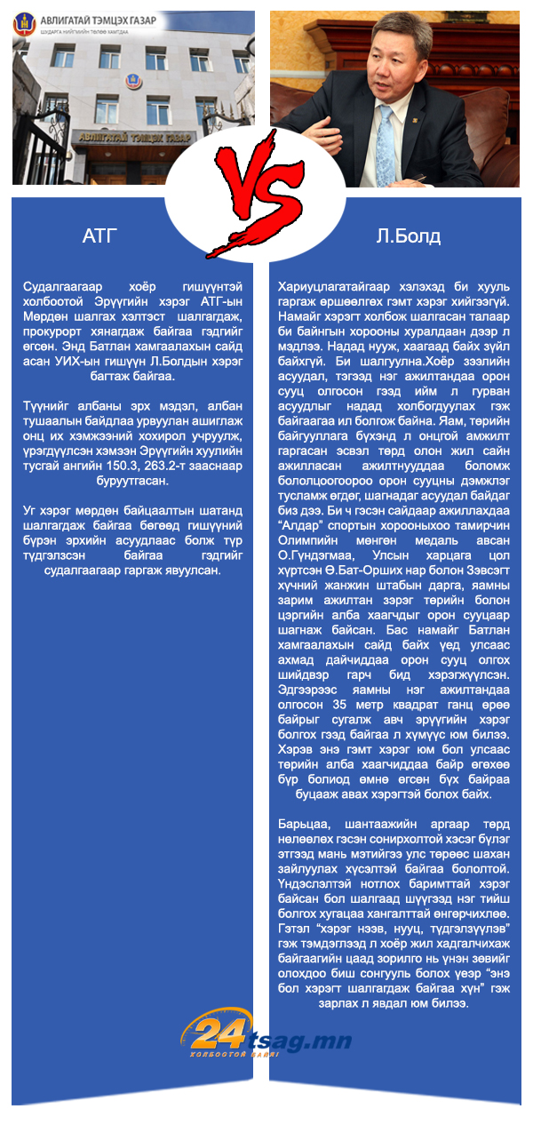 Хууль зүйн байнгын хорооны өчигдрийн хуралдааны үеэр УИХ-ын гишүүн Л.Болдыг улсын мөнгө завшсан хэмээн АТГ-аас мэдэгдсэн. Харин Л.Болд гишүүн тэдний хэлснээс тэс өөр мэдэгдлийг хийсэн билээ. Тэдний яриаг 24VS24 онцолж байна.