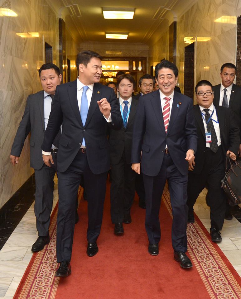 “Төв азийн орнуудад хийж байгаа айлчлалаа Монгол Улсаас эхэлж байгаадаа баяртай байна. Би Япон Улсын Ерөнхий сайдуудаас анх удаа Монгол Улсад хоёр дахь удаагаа айлчилж байна гэж Ерөнхий сайд Шинзо Абэ хэллээ. Япон, Монгол хоёр улс нь бүс нутгийн стратегийн чухал түнш орнууд юм. Миний өмнөх айлчлалаас хойш Япон Монголын эдийн засгийн түншлэлийн хэлэлцээр, Улаанбаатарын шинэ нисэх буудал барих төсөл зэрэг дээд түвшинд ярилцаж тохирсон асуудлууд бодитойгоор урагшиллаа. Энэ нь хоёр орны харилцаа бодит үйл ажиллагаагаар улам гүнзгийрч байгаагийн илрэл юм. Монгол Улсын Ерөнхий сайд Ч.Сайханбилэг Япон Улсын идэвхтэй энх тайванч бодлогыг дэмжиж байгаагаа илэрхийлсэн. Түүнчлэн улс төр, аюулгүй байдлын салбарт яриа хэлэлцээ, хамтын ажиллагааг улам идэвхтэй урагшлуулах талаар санал нэгдлээ. Монголын эдийн засгийг тууштай эдийн засгийн бодлоготойгоор, өөрийгөө тэтгэсэн хөгжлийг бий болгохын төлөө Япон Улс үргэлж хамтран ажиллахад бэлэн байна” гэж Японы Ерөнхий сайд хэллээ гэж Засгийн газрын Хэвлэл мэдээлэл, олон нийттэй харилцах албанаас мэдээллээ.