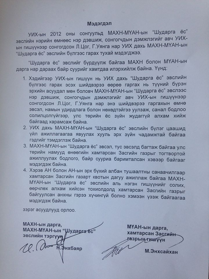 МАХН-ын дарга Н.Энхбаяр болон МҮАН-ын дарга М.Энхсайхан нар тус мэдэгдэлдээ "УИХ-ын 2012 оны сонгуульд МАХН-МҮАН-ын "Шударга ёс" эвслийн нэрийн өмнөөс нэр дэвшиж, сонгогчдын дэмжлэгийг авч УИХ-ын гишүүнээр сонгогдсон Л.Цог, Г.Уянга нар УИХ дахь МАХН-МҮАН-ын "Шударга ёс" эвслийн бүлгээс гарах тухай мэдэгджээ. Г.Уянга, Л.Цог нар улс төрийн ёс зүйн жудаггүй алхам байгаад харамсаж байна. Эвслийн бүлэг цаашид үйл ажиллагаагаа явуулах хууль эрх зүйн чадамжтай байгаа гэдгийг тэмдэглэж байна" зэргээр бичжээ.