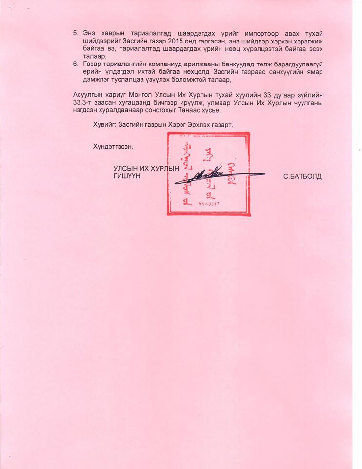 Тэрчлэн 2016 оны зуны улирлын цаг уурын төлөв, прогноз хэзээ тодорхой болох, үүнтэй холбоотойгоор тариалалтын хугацаанд учирч болох цаг уурын гэнэтийн үзэгдэлээс урьдчилан сэргийлэх чиглэлээр ямар арга хэмжээ авахаар төлөвлөж байгаа талаар мэдээлэл авахыг хүсчээ. Мөн хаврын тариалалтад шаардагдах үрийг импортоор авах тухай шийдвэр хэрхэн хэрэгжиж байгаа, тариалалтад шаардагдах үрийн нөөц хүрэлцээтэй эсэхийг тодруулсан байна. Түүнчлэнгазар тариалангийн компаниуд арилжааны банкуудад төлж барагдуулаагүй өрийн үлдэгдэл ихтэй байгаа нөхцөлд Засгийн газраас санхүүгийн ямар дэмжлэг туслалцаа үзүүлэх боломжтой талаар салбарын сайдаас асууж, асуулгын хариуг Монгол Улсын Их Хурлын тухай хуульд заасан хугацаанд бичгээр ирүүлж, улмаар Улсын Их Хурлын чуулганы нэгдсэн хуралдаанаар сонсгохыг хүсчээ.