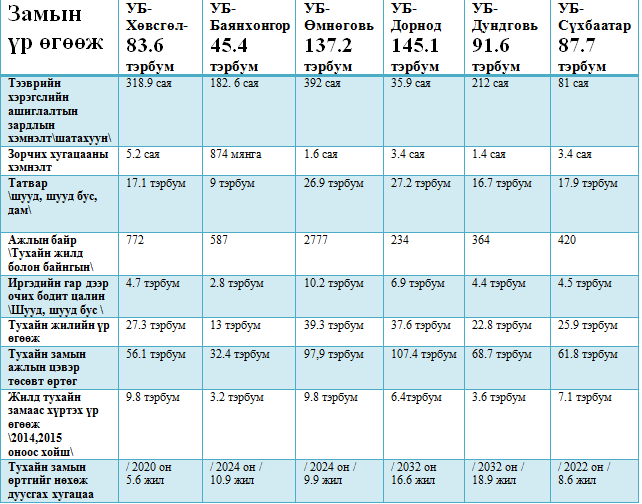 Дээрх хүснэгтээс харахад Хөвсгөл, Өмнөговь аймгийн чиглэлийн авто зам яагаад илүү ажлын байр бий болгож, төсөвт өртгөө хурдан нөхөхөөр байгааг анзаарай. Аль болохоор тэр замаар олон хүн зорчиж, тээвэрлэлт хийгдэж, хөдөлгөөн нэмэгдэх тусам мөнгө үржиж байдаг байх нь.