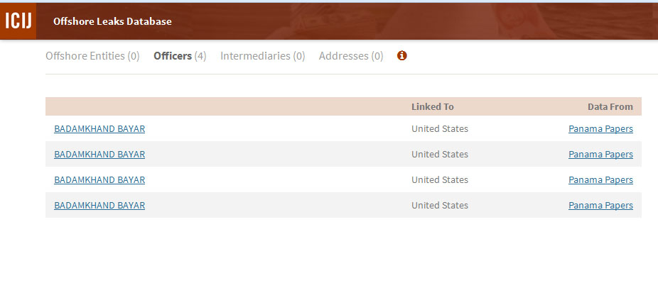 Урд шөнө “offshoreleak.icij.org” албан ёсны цахим хуудсан дээр Монголын оффшорчидын мэдээлэл тавигдсан нь дуулиан тариад байна. Мөн Монголд төрж өссөн хэдий гадаадын харъяат болсон иргэдийн дунд оффшор данстанууд байгаагийн дотор Ерөнхий сайд асан С.Баярын охид байна. Тодруулбал, Баярын Бадамханд, Баярын Нандин нар аль хэдий оффшор данстай болсон нь ил боллоо.