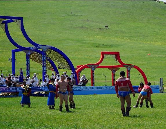 Яг одоо буюу Бэсрэг наадмын үеэр Төрийн есөн хөлт цагаан тугийг залж байна.