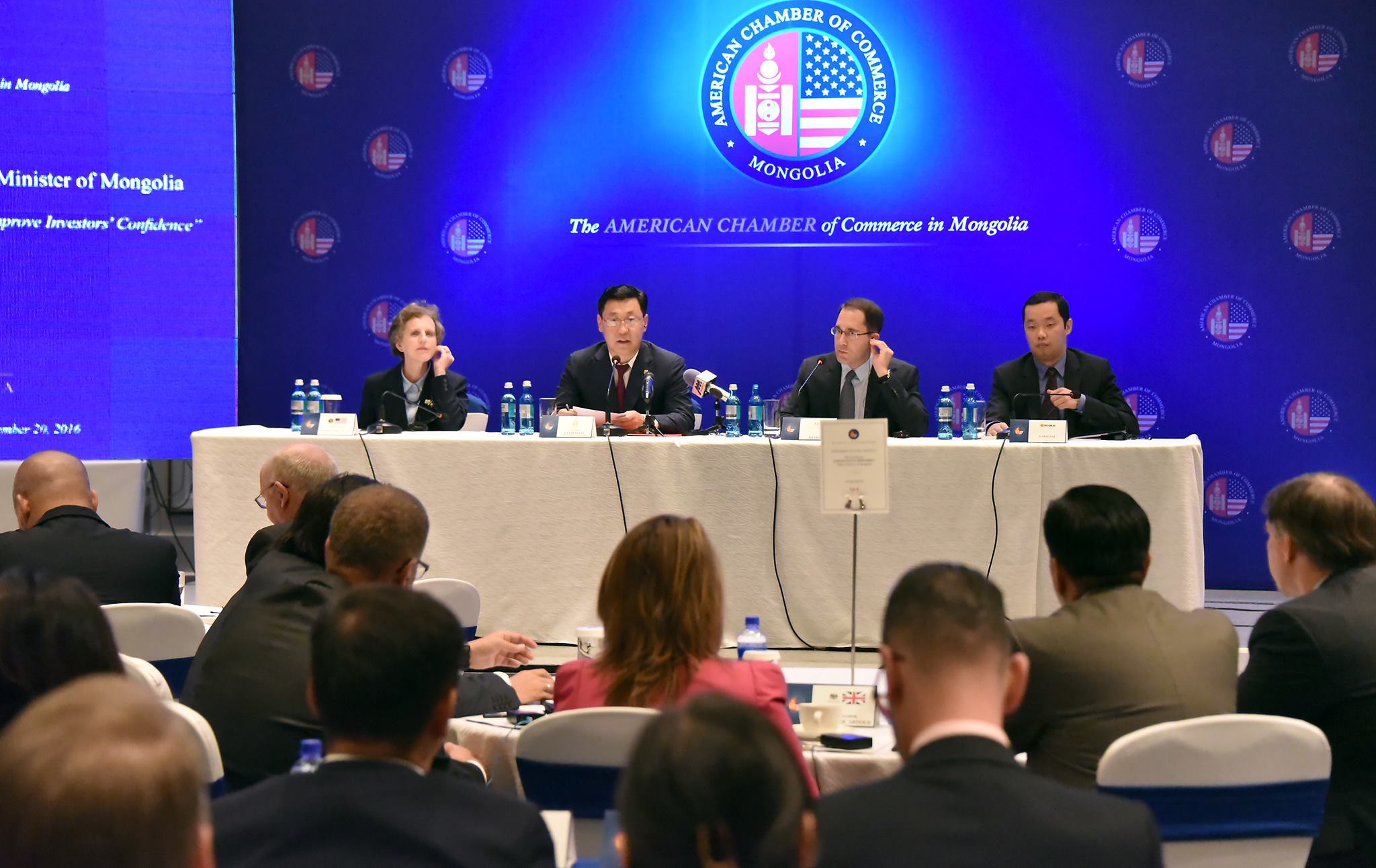 Ерөнхий сайд Ж.Эрдэнэбат Монгол дахь Америкийн худалдааны танхимын гишүүдийн уулзалтад оролцож, Засгийн газрын үйл ажиллагааны хөтөлбөр болон хөрөнгө оруулалтыг татах чиглэлээр хэрэгжүүлэх арга хэмжээний талаар мэдээлэл хийн үг хэллээ.