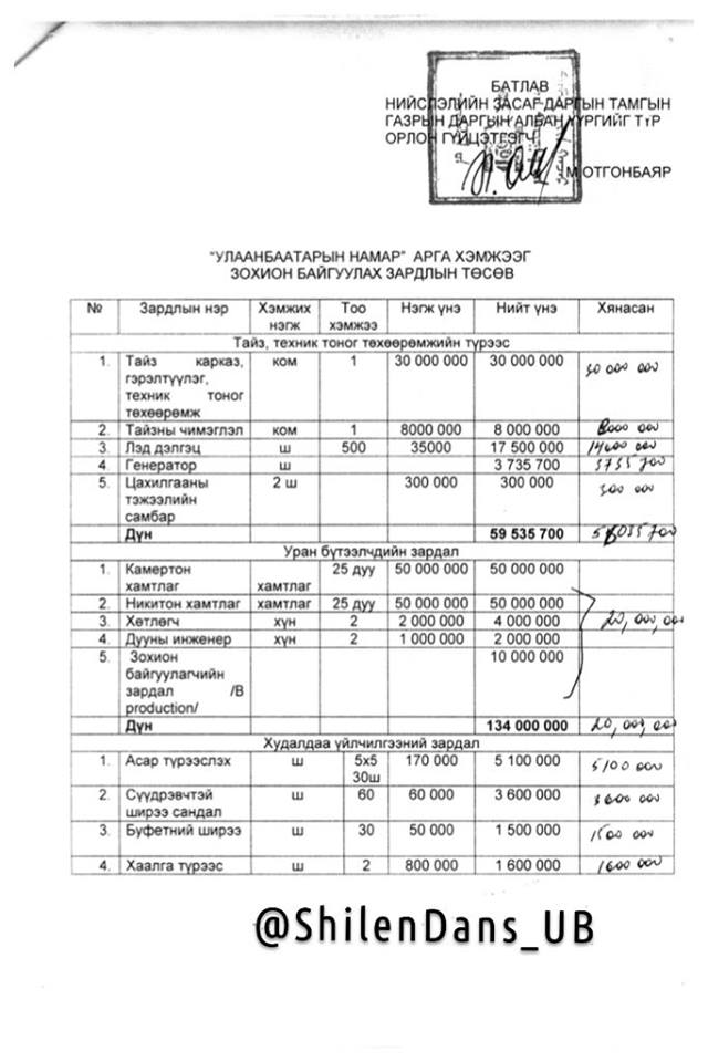 Бас Сүхбаатарын талбайд зохион байгуулагдсан “Камертон”, “Никитон” хамтлагийн тоглолт буюу “Улаанбаатарын намар” шоуг улсын төсвийн хөрөнгөөр буюу 217’635’700 төгрөгөөр хийсэн баримт ил боллоо.