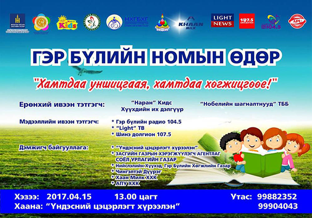 “Дэлхийн гэр бүлийн номын өдөр”-ийн хүрээнд “Хүүхдийг номтой нөхөрлөхөд ээжүүдийн оролцоо” сэдэвт өдөрлөгийг Үндэсний цэцэрлэгт хүрээлэнд 2017.04.15 ны өдөр зохион байгуулах гэж байна. Өдөрлөгийн үер хүүхдүүдэд бага насанд нь номтой зөв харьцах, номын сайн найз болох, ном уншихын ач холбогдлыг ойлгуулах, зөв дадал хэвшил олгох сургалт, зөвлөмжүүд, хүүхдийн номын худалдаа, вагон аялал, төрөл бүрийн тэмцээн уралдаанууд, урлагийн тоглолт, гэр бүлд чиглэсэн мэдээ мэдээллүүд зэрэг олон төрлийн үйл ажиллагаа зохион байгуулагдах юм.