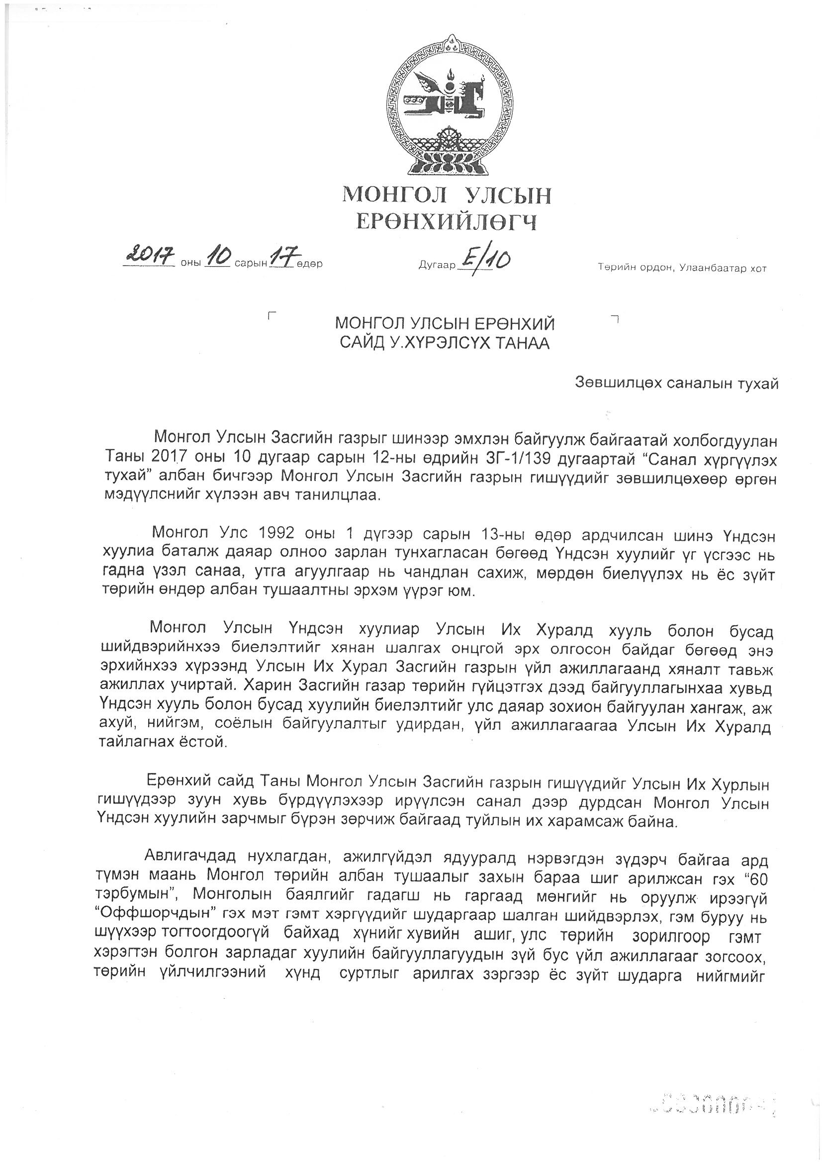 Монгол Улсын Ерөнхийлөгч Х.Баттулга Засгийн газрын гишүүдийг зөвшилцөх албан бичигт өнөөдөр хариу өглөө. Монгол Улсын Ерөнхий сайд У.Хүрэлсүхэд уг хариу албан бичгийг гардуулан өгч ажилд нь амжилт хүслээ.