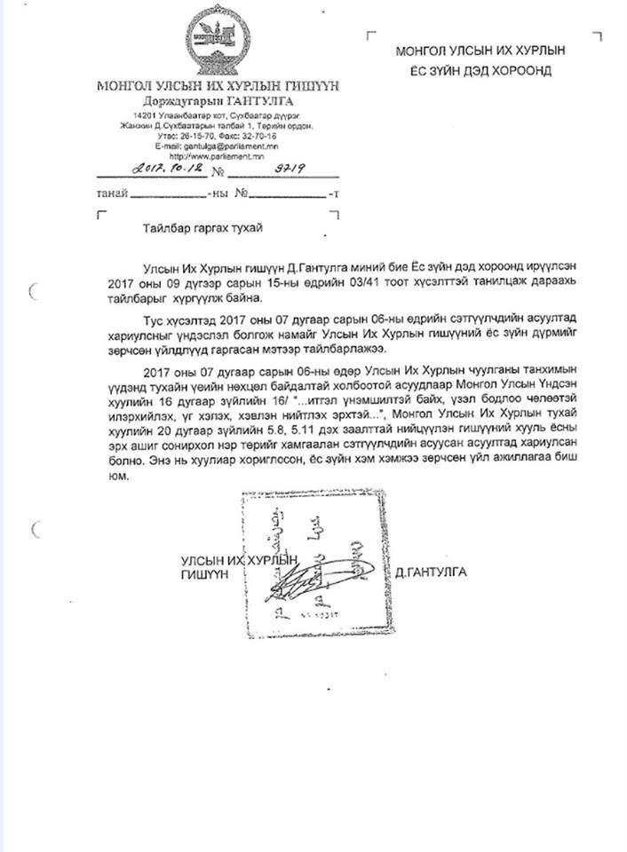 Харин УИХ-ын гишүүн Д.Гантулга Ёс зүйн дэд хороонд бичгээр тайлбар хүргүүлсэн байна. Тэрбээр тайлбартаа "УИХ-ын гишүүн Д.Гантулга миний бие Ёс зүйн дэд хороонд ирүүлсэн хүсэлттэй танилцаж, дараах тайлбарыг хүргүүлж байна. Тус хүсэлтэд 2017 оны долдугаар сарын 6-ны өдрийн хэвлэлийн хурлын үеэр сэтгүүлчдийн асуултад хариулсныг үндэслэл болгож намайг УИХ-ын гишүүний ёс зүйн дүрмийг зөрчсөн үйлдлүүд гаргасан мэтээр тайлбарлажээ.