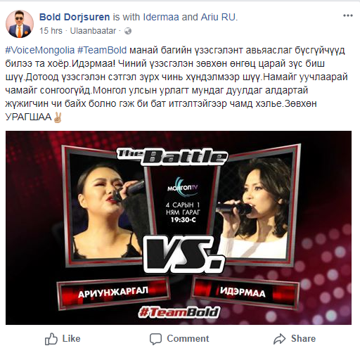 Томоохон шоу нэвтрүүлгүүдийг Монгол Улсдаа нутагшуулж байгаа телевизийн “The Voice of Mongolia” шоуны халз тулаан үргэлжилж байна. Үзэгчдийг байлдан дагуулах уг шоуны оролцогчдын тулаанч ширүүхэн өрнөсөөр. Шүүгчид хэнийг нь авч үлдэх вэ гэдэг дээр сонголт хийх гэж багагүй асуудалд орж байгаа нь илт. Өчигдрийн дугаарт шүүгч Д.Уламбаяр, Д.Болд нар хамгийн хэцүү сонголтыг хийсэн хэмээн сошиал ертөнцөөр шуугиж эхлэв. Д.Болдыг хэцүү сонголт хийлгэсэн оролцогчид нь Ж.Ариунжаргал, С.Идэрмаа нар байлаа. Шалгуурт тэнцэж, тулаанд ялах, ялагдахыг шийдэх дуу нь "Little Mix" хамтлагийн “Shout out to my ex” дуу байсан.