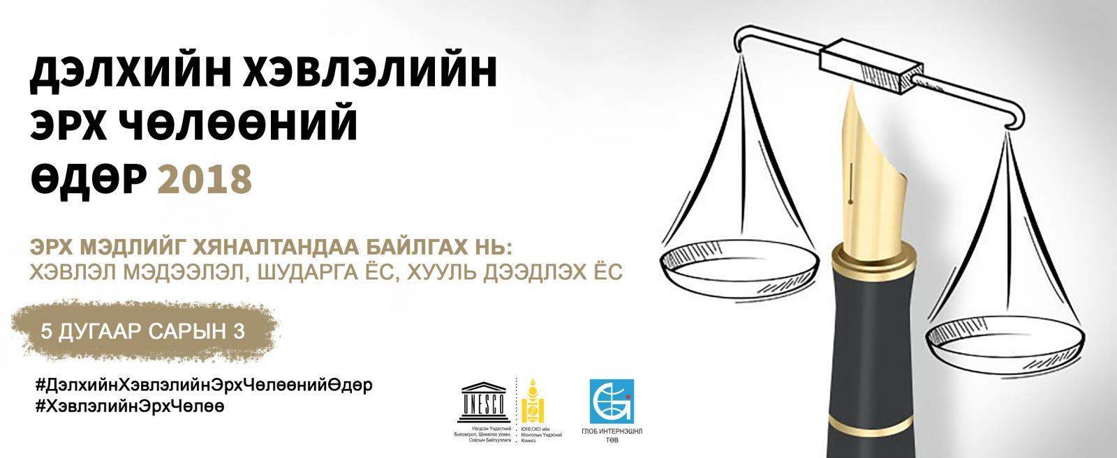 Өнөөдөр дэлхийн хэвлэлийн эрх чөлөөний өдөр. НҮБ-ын Ерөнхий Ассамблейн шийдвэрээр 1993 онд жил бүрийн тавдугаар сарын 3-ны өдрийг Дэлхийн хэвлэлийн эрх чөлөөний өдөр болгон тэмдэглэдэг болсон юм. Манай сэтгүүлчид,уран бүтээлчид Дэлхийн хэвлэлийн эрх чөлөөний өдрийг 25 дахь жилдээ тэмдэглэж байна. Энэ өдрийг дэлхийн 100 гаруй орон тэмдэглэн өнгөрүүлдэг юм. Уг өдрийг жил бүр өөр сэдвийн дор тэмдэглэдэг бөгөөд энэ жил “Эрх мэдлийг хяналтандаа байлгах нь: Хэвлэл мэдээлэл, шударга ёс, хууль дээдлэх ёс”сэдвийн дор тэмдэглэж байна.