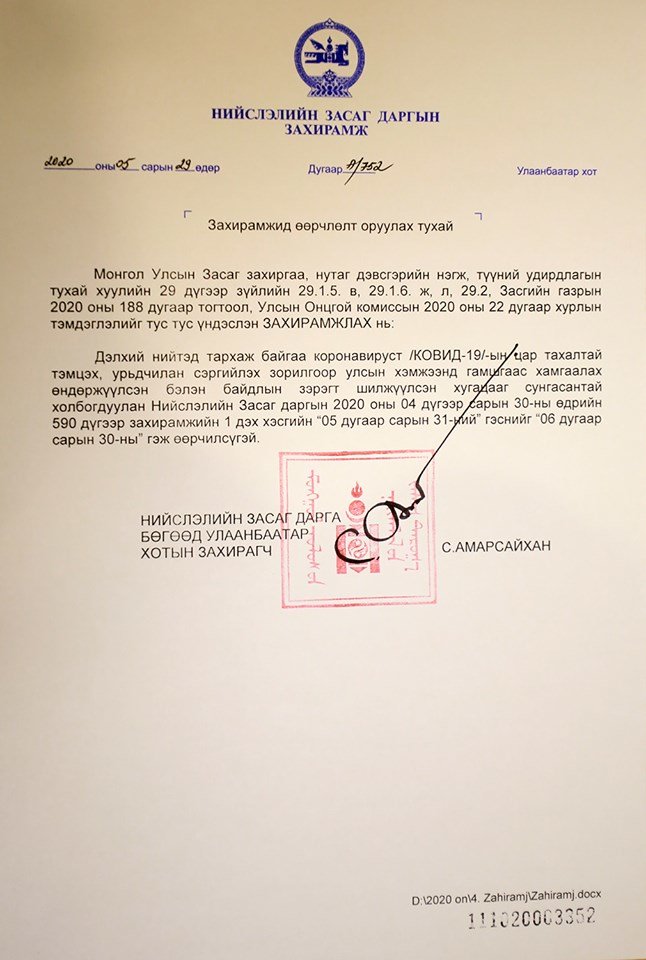Захирамжид “Дэлхий нийтэд тархаж байгаа коронавируст /КОВИД-19/ цар тахалтай тэмцэх, урьдчилан сэргийлэх зорилгоор улсын хэмжээнд гамшгаас хамгаалах өндөржүүлсэн бэлэн байдлын зэрэгт шилжүүлсэн хугацааг сунгасантай холбогдуулан нийслэлийн Засаг даргын 2020 оны 04 дүгээр сарын 30-ны өдрийн 590 дүгээр захирамжийн 1 дэх хэсгийн “05 дугаар сарын 31-ний” гэснийг “06 дугаар сарын 30-ны” гэж өөрчилсүгэй” гэжээ.