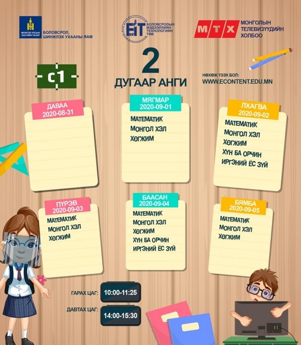 Энэ сард өмнө үзсэн мэдлэлийг бататгах хичээл орох бөгөөд нийслэлийн сурагчид хоёр өдрийн хичээлийг цахим болон теле хэлбэрээр үзэх юм. Ингээд теле хичээлийн хуваарийг танилцуулъя.
