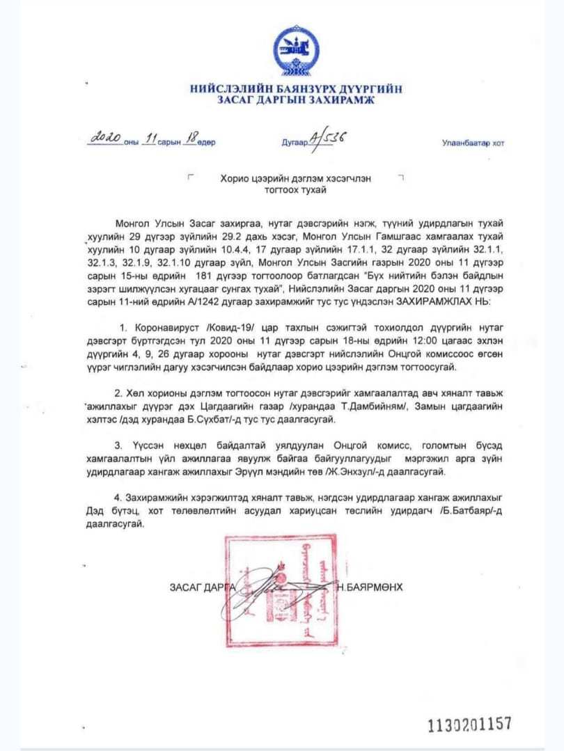 Баянзүрх дүүргийн нутаг дэвсгэрт коронавирусний халдварын сэжигтэй тохиолдол бүртгэгдсэн тул өнөөдрөөс гурван хороонд хэсэгчилсэн хөл хорио тогтоолоо. Тодруулбал, Баянзүрх дүүргийн дөрөв, ес, 26 дугаар хороонд хэсэгчилсэн хөл хорио тогтоох тухай дүүргийн Засаг даргын захирамж гарсан байна. Энэ хүрээнд тухайн хороодын замын хөдөлгөөнийг хаахаар болжээ.