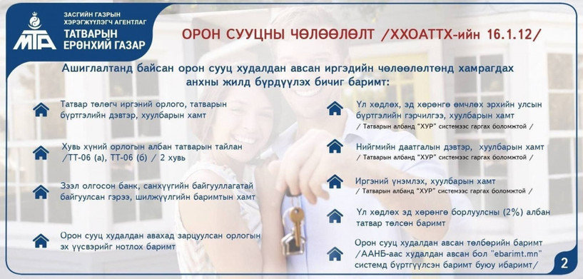 Анх удаа орон сууц худалдаж авсан болон сургалтын төлбөр төлсөн татвар төлөгчид ХХОАТ-ын хөнгөлөлтөд хамрагддаг. Татварын тайлан тушаах, хүлээн авах ажлыг бүрэн цахимжуулж хувь хүний татварын тайлан, хөнгөлөлтийн баримт бичгийн цахим татварын систем /etax.mta.mn/-ээр дамжуулан авч байна.