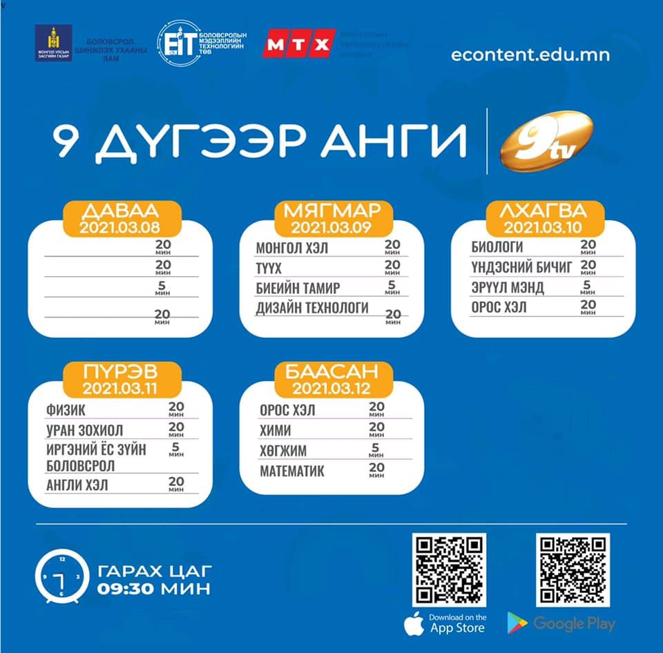 Энэ долоо хоногийн буюу гуравдугаар сарын 9-12-ны теле хичээлийн хуваарийг хүргэж байна.