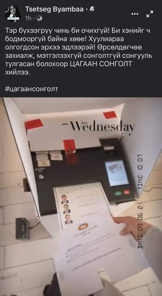 Энэ нь Сонгуулийн тухай хуулийн 30.2-т саналын хуудсанд тэмдэглэсэн саналаа болон бусад сонгогчийн тэмдэглэсэн саналыг баримтжуулан зураг авсан, дүрс бичлэг хийсэн, шууд дамжуулсан, бусдад харуулсан бол 10 мянган нэгжтэй тэнцэх хэмжээний төгрөгөөр торгохоор хуульчилсан юм.