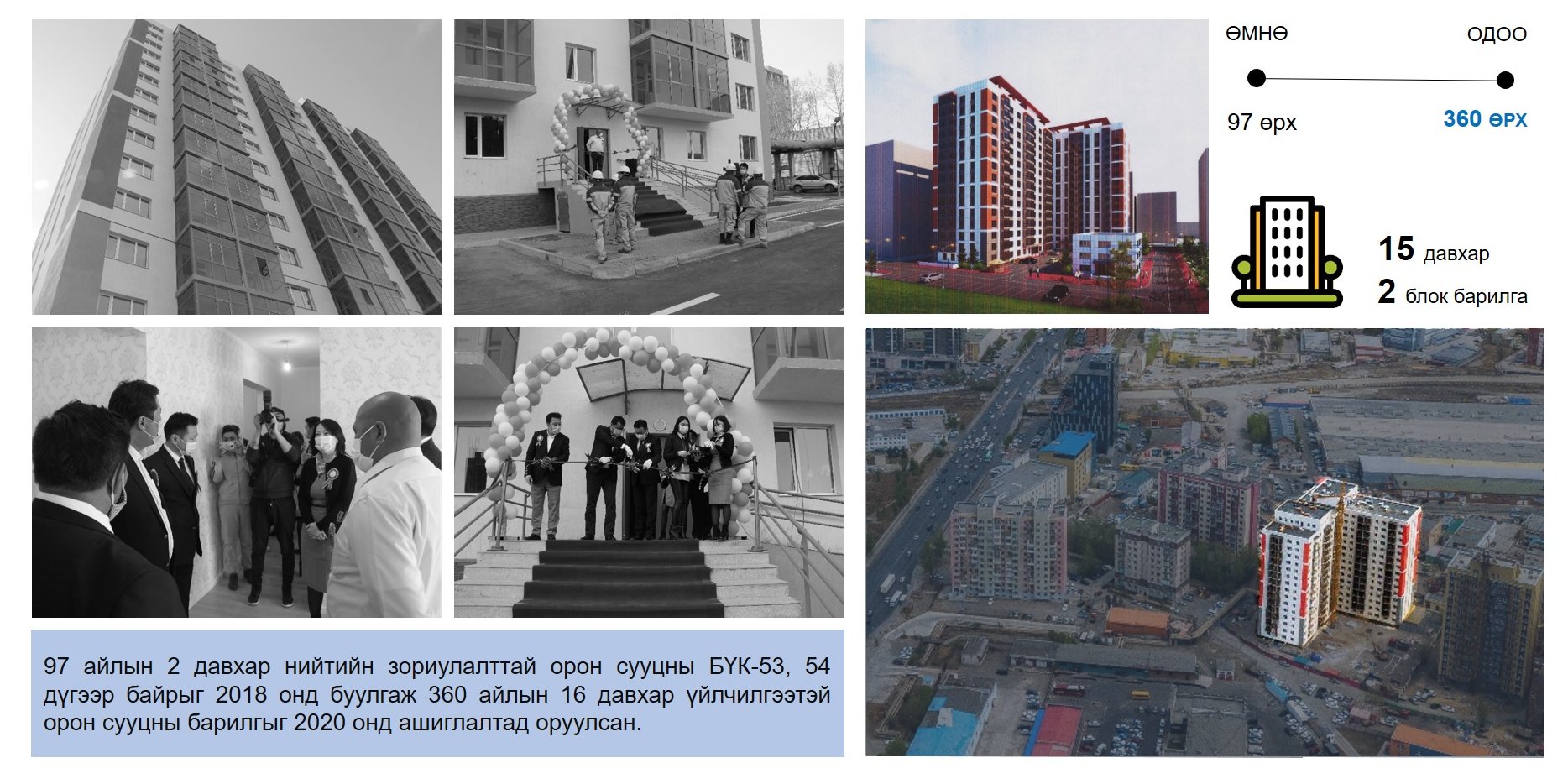 Төр, хувийн хэвшил, иргэдийн хамтын ажиллагааны хүрээнд амжилттай хэрэгжүүлсэн төслийн талаар цувралаар танилцуулж байна. Нийслэлийн мэргэжлийн хяналтын улсын байцаагчийн 2014 оны 01-01/05 дугаар шийдвэрээр Хан-Уул дүүргийн хоёрдугаар хороо, “Мишээл экспо” төвийн баруун талд байрлах 1950 онд ашиглалтад орсон 97 айлын хоёр давхар нийтийн зориулалттай орон сууцны БҮК-53, 54 дүгээр байрыг ашиглалтын шаардлага хангахгүй болохыг тогтоосон. Улмаар Нийслэлийн Засаг даргын 2015 оны А/782 дугаар захирамжаар орон сууцыг буулгах, дахин төлөвлөн, шинээр барилгажуулах шийдвэр гаргасан юм. Тус шийдвэрийн дагуу төсөл хэрэгжүүлэгчийг сонгон шалгаруулж, 2018 онд дээрх барилгуудыг буулган, 15 давхар 360 айлын, үйлчилгээтэй орон сууцны барилгыг 2020 онд ашиглалтад оруулсан.
