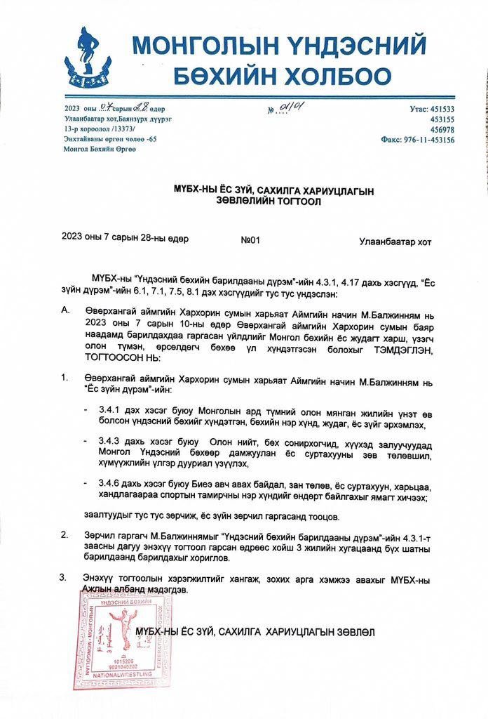 Холбооны зүгээс түүнд арга хэмжээг шуурхай авсан бол Хэнтий аймгийн түүхт 100 жилийн ойн наадамд “луйвардуулсан” гарди Ц.Бямба-Отгоны асуудлыг хэлэлцсэн хүнгүй тул намжлаа.