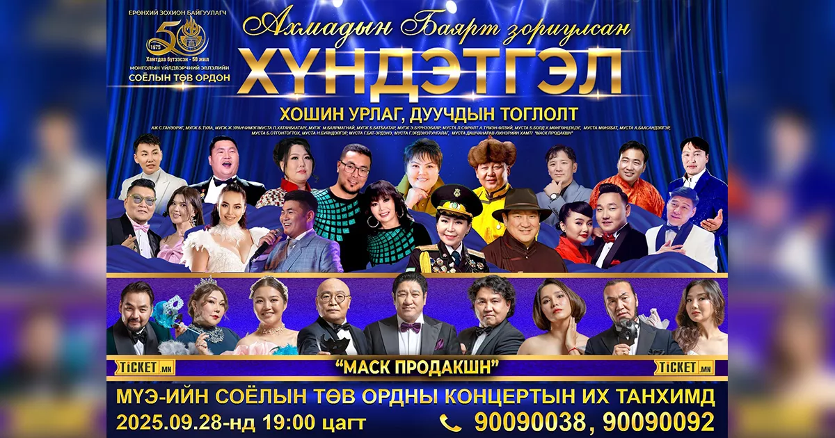 Тайлбар: МҮЭ-ИЙН СОЁЛЫН ТӨВ ОРДНЫ 50 ЖИЛИЙН ОЙГ УГТАЖ, ОУ-ЫН АХМАДЫН БАЯРТ ЗОРИУЛАН ХОШИН УРЛАГ, ДУУЧДЫН ХАМТАРСАН ТОГЛОЛТ 5 ДАХЬ ЖИЛДЭЭ ЗОХИОН БАЙГУУЛЖ БАЙНА.