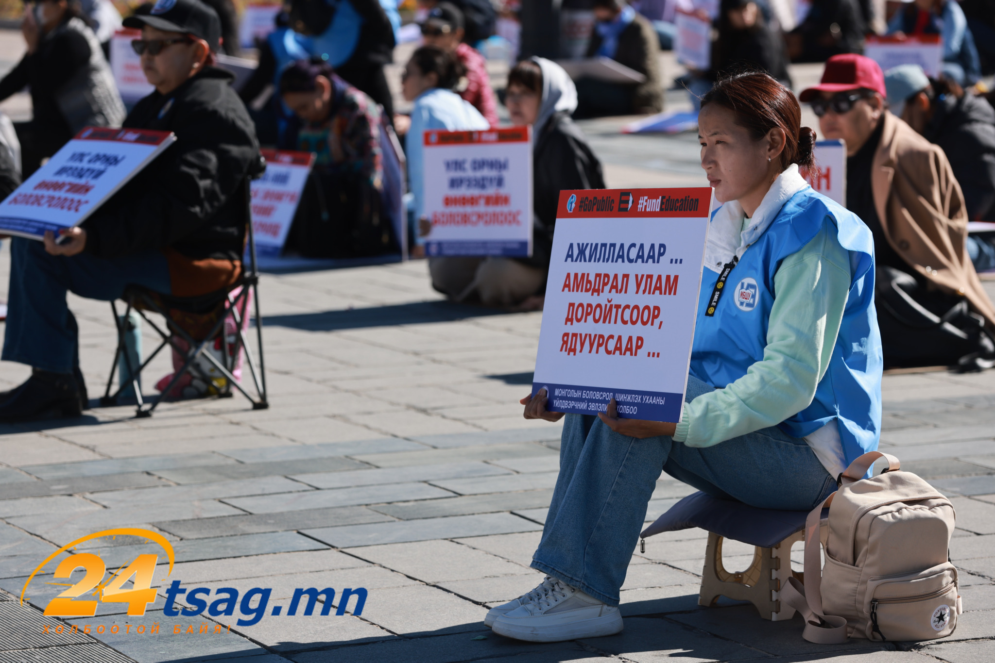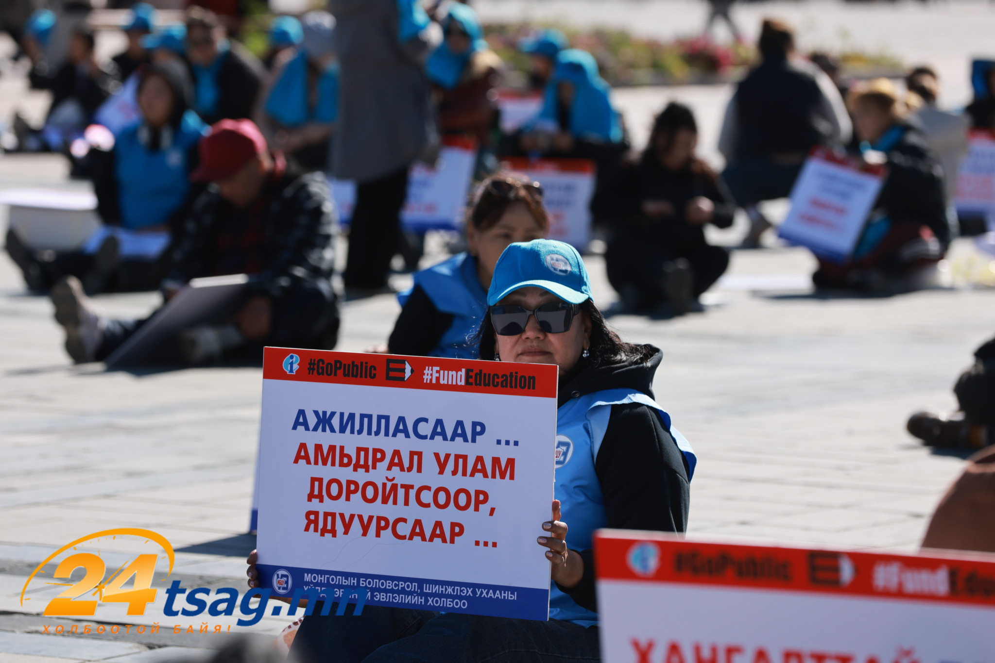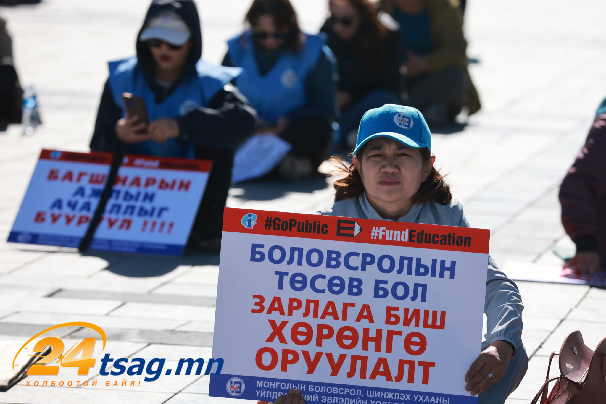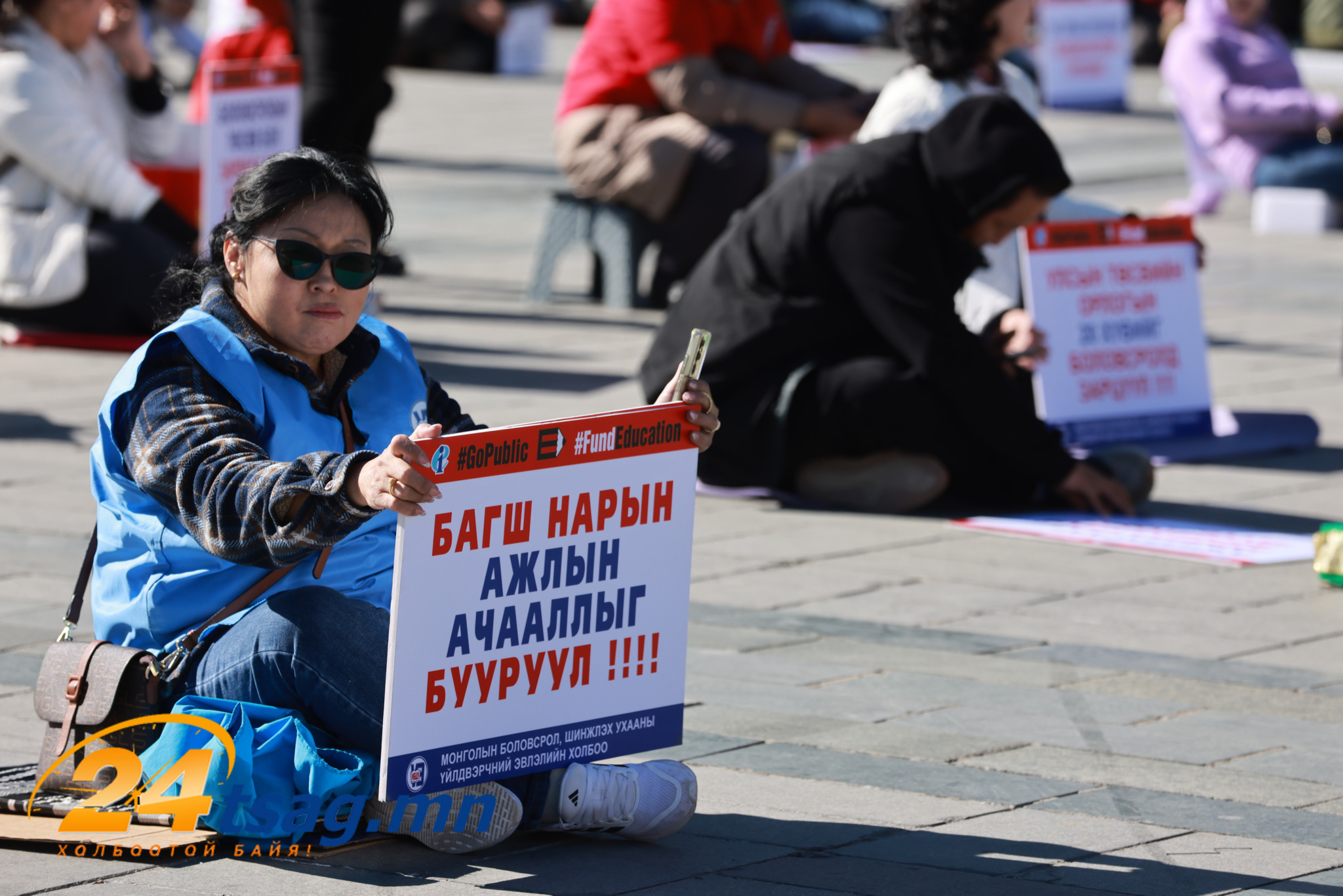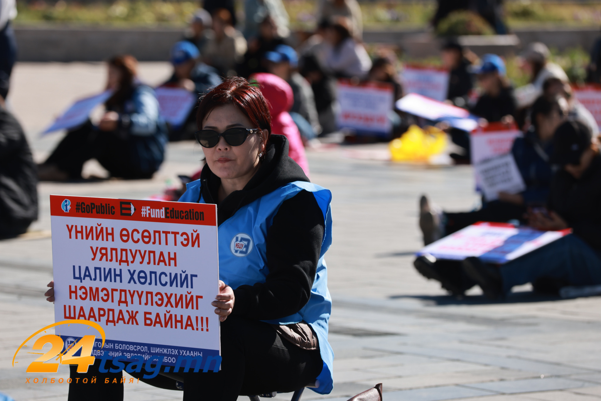 Боловсролын салбарын цалин хөлсийг нэмэгдүүлэхийг шаардсан багш нар Сүхбаатарын талбайд суулт хийлээ.