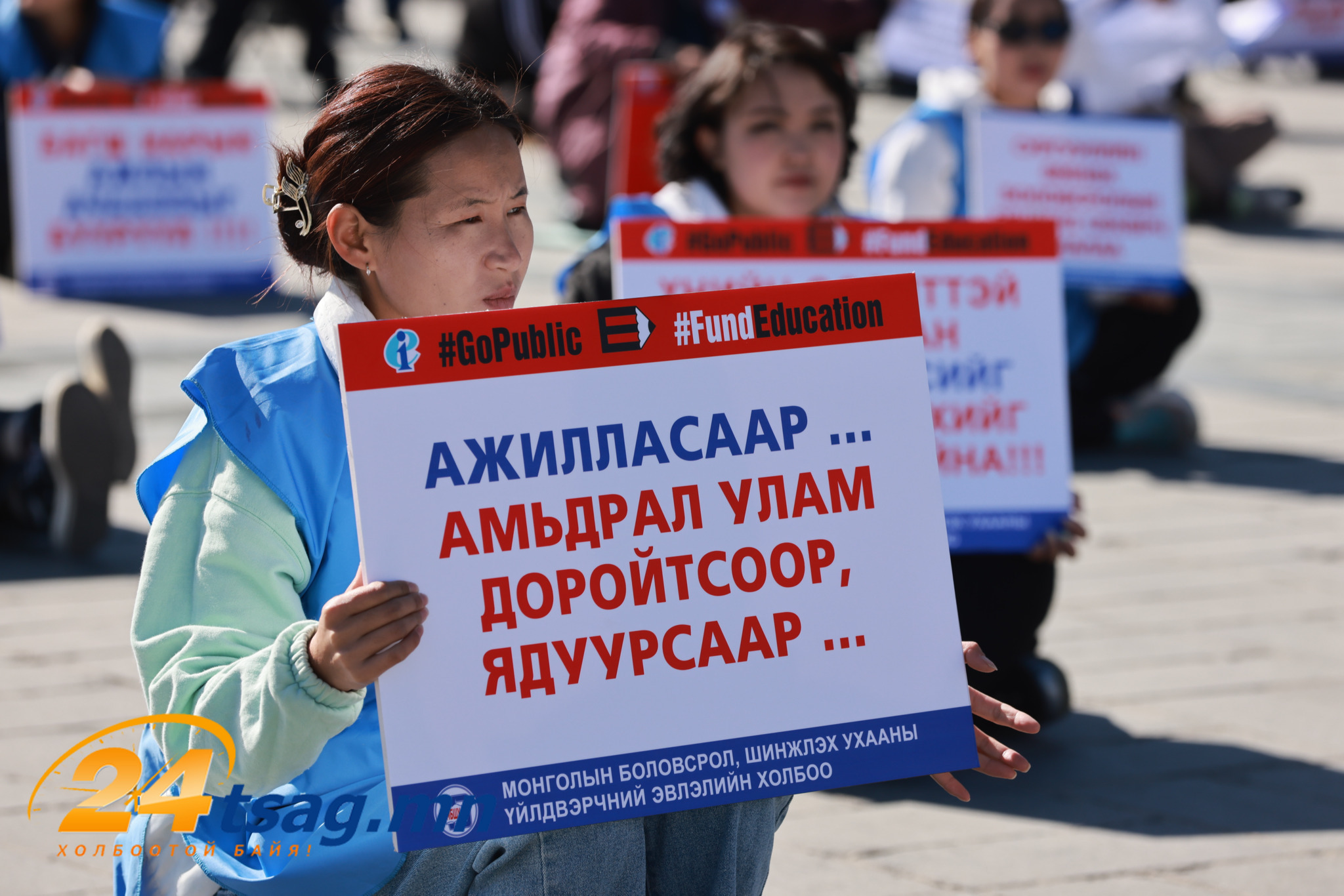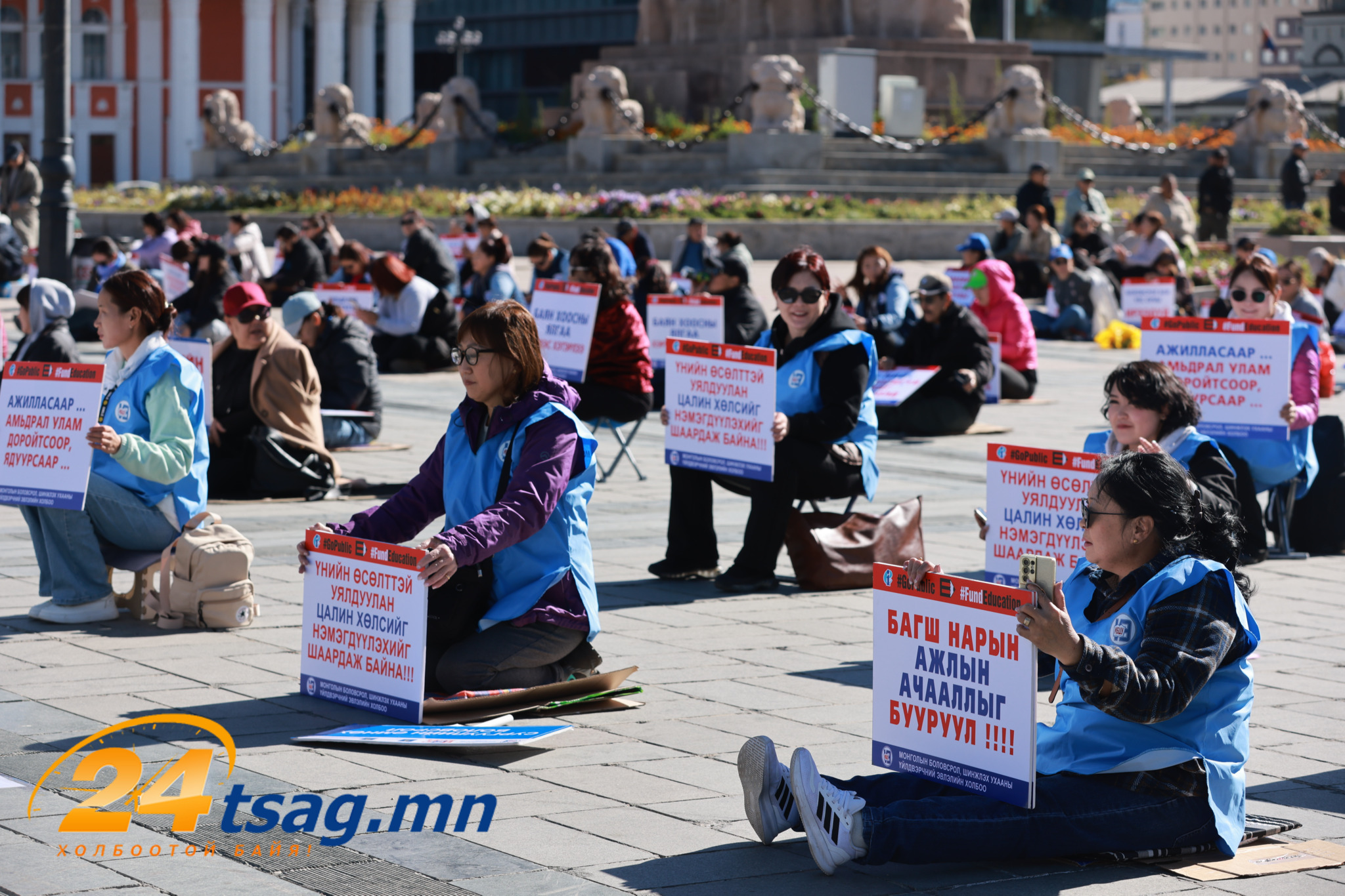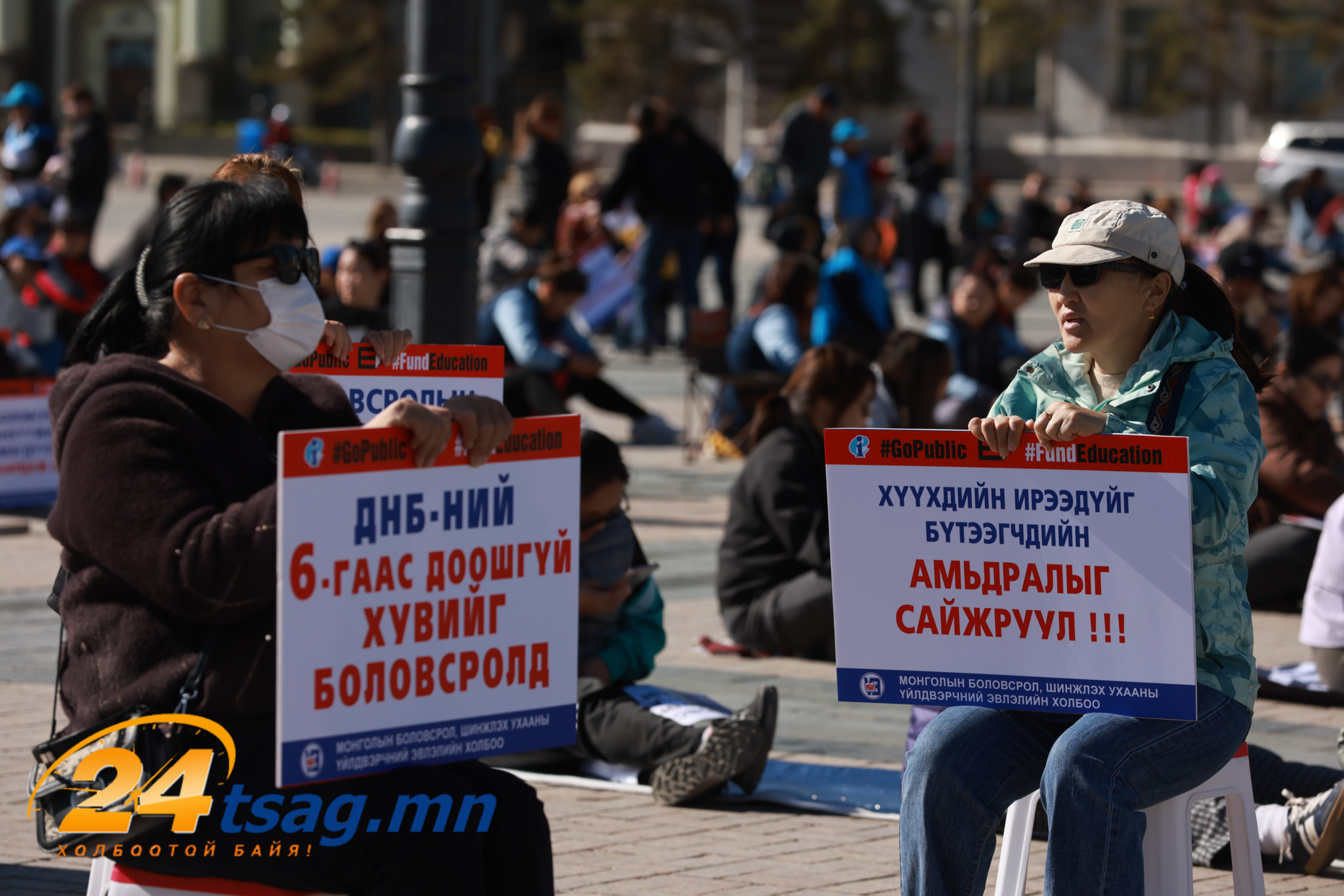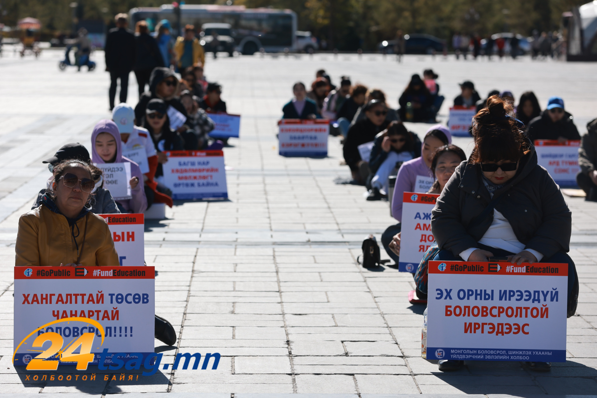 Боловсролын салбарын цалин хөлсийг нэмэгдүүлэхийг шаардсан багш нар Сүхбаатарын талбайд суулт хийлээ.