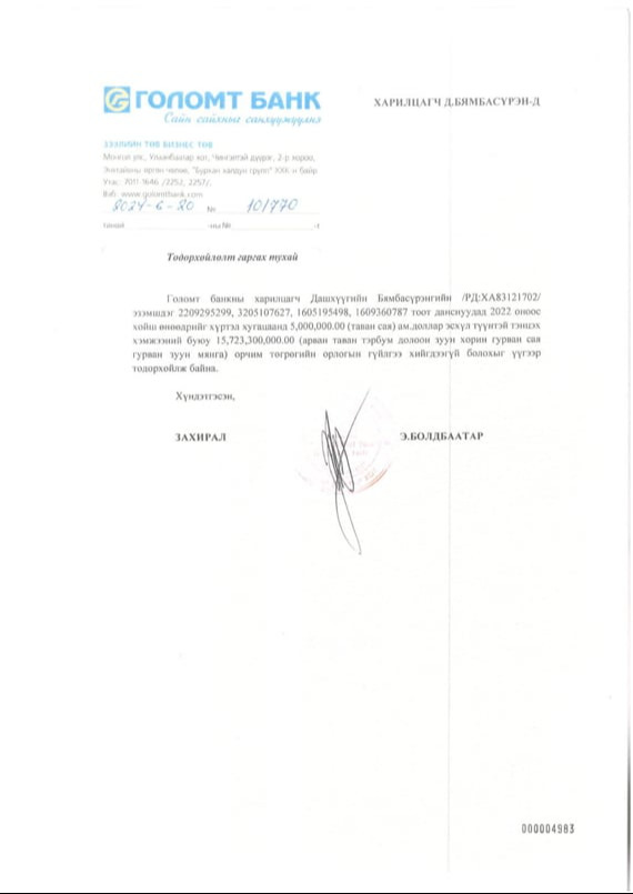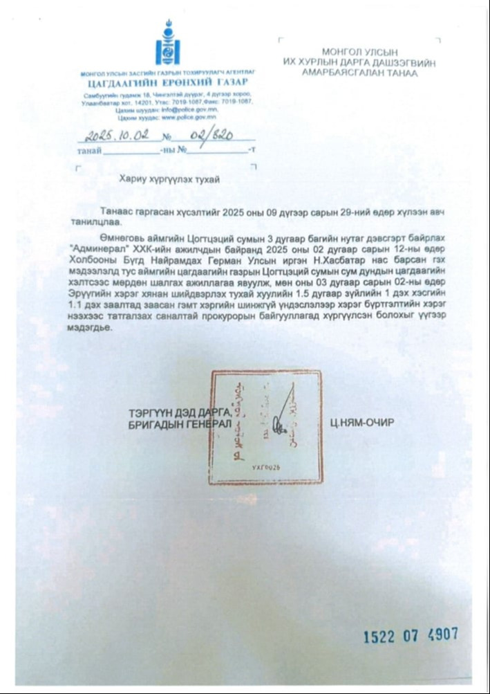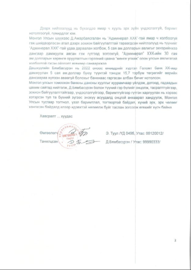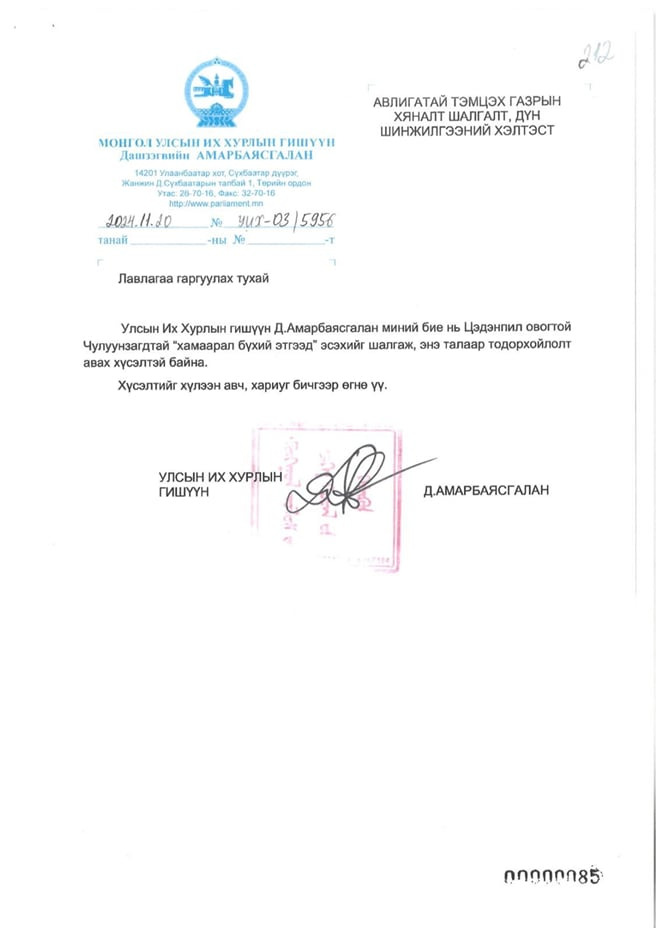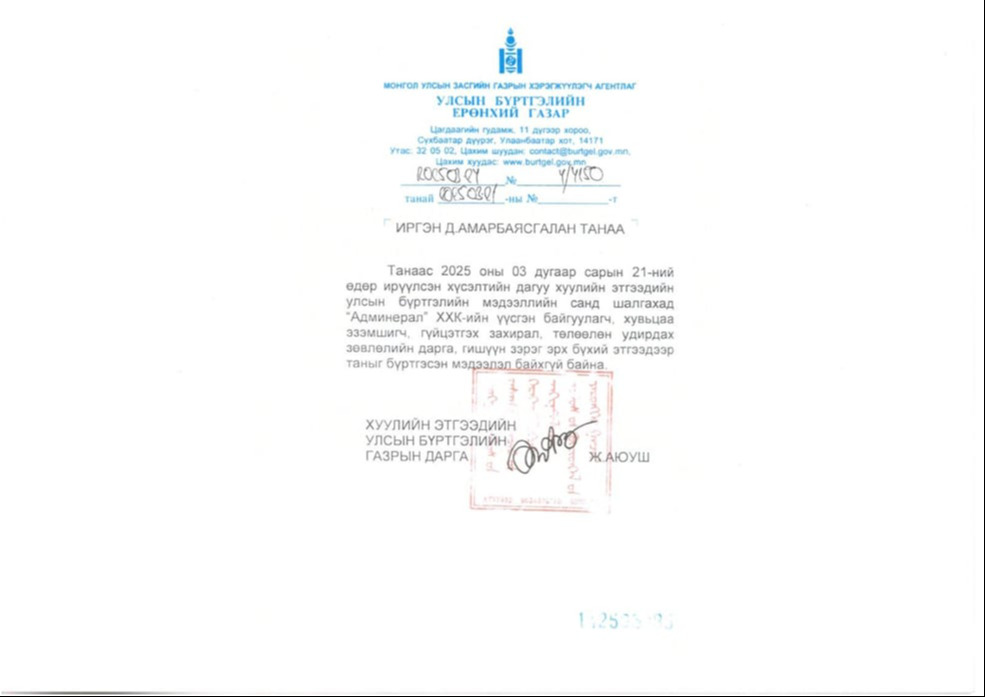 УИХ-ын дарга Д.Амарбаясгалан Улсын бүртгэлийн ерөнхий газраас 2023, 2025 онд удаа дараалан лавлагаа авчээ. Уг тодорхойлолтод “Админерал” ХХК-ийн үүсгэн байгуулагч, хувьцаа эзэмшигч, эцсийн өмчлөгч болон гүйцэтгэх удирдлагаар таны нэр бүртгэгдээгүй байна” гэжээ. Мөн Д.Амарбаясгалан 2024 оны арван нэгдүгээр сарын 20-ны өдөр АТГ-ын Хяналт шалгалт, дүн шинжилгээний хэлтэст лавлагаа гаргуулах хүсэлт гаргасан байна. “Д.Амарбаясгалан миний бие Цэдэнпил овогтой Чулуунзагд, Цэдэнпил овогтой Лхамжав нартай хамаарал бүхий этгээд эсэхийг шалгаж, энэ талаар тодорхойлолт гаргаж өгнө үү” гэжээ. Энэ албан бичгийн хариуг АТГ-аас 2024 оны 12 дугаар сарын 12-ны өдөр ирүүлсэн байна. Энэ бичигт “Таны албан бичгүүдийг хүлээж авч, Нийтийн албанд нийтийн болон хувийн ашиг сонирхлыг зохицуулах, ашиг сонирхлын зөрчлөөс урьдчилан сэргийлэх тухай хуулийн 28 дугаар зүйлийн 28.12т заасны дагуу хянан үзлээ. Уг албан бичигт дурдсан иргэд тантай хамаарал бүхий этгээд гэх нөхцөл байдал тогтоогдоогүй байна” гэжээ. Өөрөөр хэлбэл, УИХ-ын дарга Д.Амарбаясгалан “Админерал” гэх компанитай холбоогүй, тэндээс 5 сая ам.доллар авсан, гадаадын иргэнийг нухаад чандарлачихсан гэх хэрэгт ямар ч хамааралгүй гэдгийг Тагнуулын Ерөнхий газар,