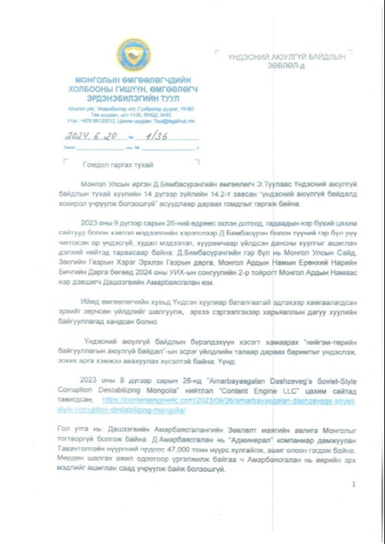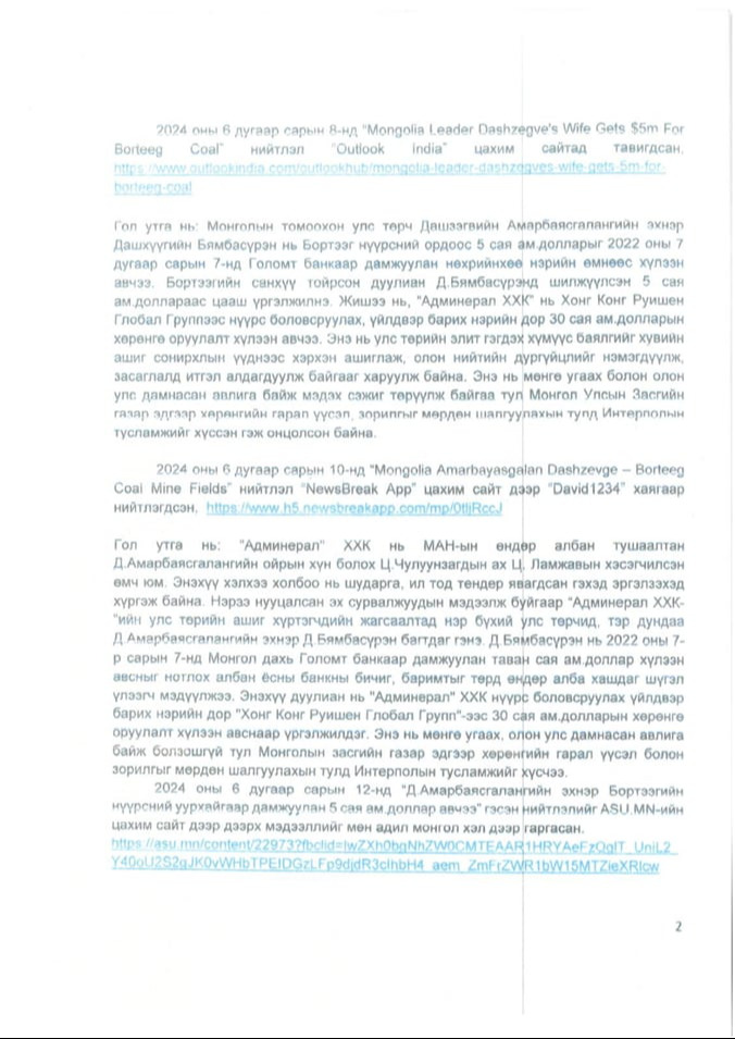 Засгийн газрыг огцруулах асуудлыг Төрийн байгуулалтын байнгын хороон дээр хэлэлцэв. “Д.Амарбаясгаланг гэм буруутай гэж нотлох ямар баримт байна” гэсэн асуултад Монгол Улсын Ерөнхий сайд маань “Германы сайт дээр мэдээлэл гарсан. Тэгээд л би итгэсэн” гээд нүдээ бүлтэлзүүлээд сууж байх юм. УИХ-ын дарга Д.Амарбаясгалангийн эхнэр Д.Бямбасүрэнгийн өмгөөлөгч Э.Туул 2024 оны зургадугаар сарын 20-нд Үндэсний аюулгүй байдлын зөвлөлд 1/369 тоот албан бичгээр гомдол гаргажээ. Энэ гомдолд “2023 оны есдүгээр сарын 26-нд Amarbayasgalan Dashzeveg’s Soviet-Style Corruption Destabilizing Mongolia нийтлэл“ Content Engine LLC”-ийн нэр дээр гарсан байдаг. “Д.Амарбаясгалан нь“Админерал” компаниар дамжуулан Тавантолгойн нүүрсний ордоос 47000 тонн нүүрс хулгайлсан” гэсэн агуулгатай нийтлэл гарсан. Мөн 2024 оны зургадугаар сарын 8-нд “Mongolia Leader Dashzeveg’s Wife Gets $5M for Borteeg Coal” нийтлэл гарсан. Ямар ч үндэслэлгүй нийтлэл гарч, Монгол Улсын томоохон банкны хуулгыг хуурамчаар үйлдэж, их хэмжээний хээл хахуулийн хэрэгт холбогдуулан гүтгэж байна. Энэ үйлдэл нийгэм, төрийн аюулгүй байдлын эсрэг үйлдсэн гэмт хэрэг гэж үзэх үндэстэй байна” гэсэн хүсэлтийг Үндэсний аюулгүй байдлын зөвлөлд гаргажээ.