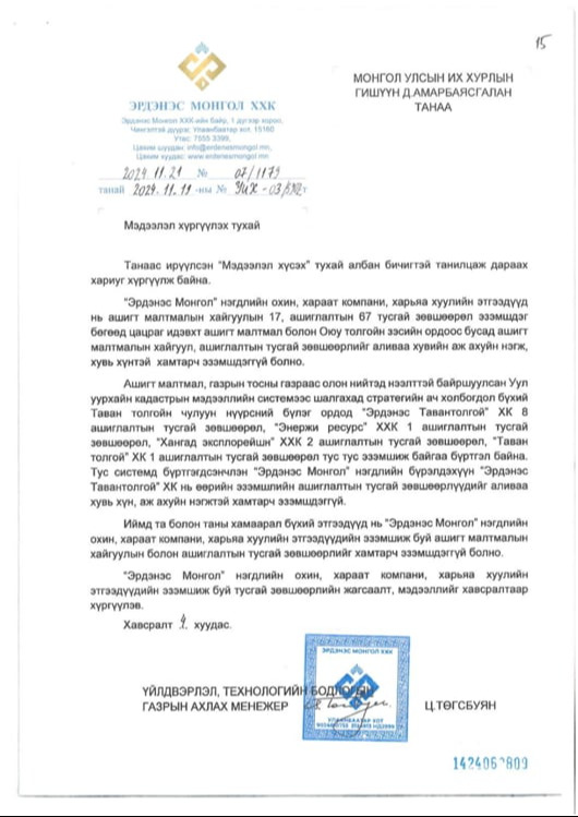 зөвшөөрөл эзэмшдэг. “Эрдэнэс Монгол” ХХК- ийн нэгдлийн бүрэлдэхүүнд багтдаг “Эрдэнэс Тавантолгой” ХХК нь өөрийн эзэмшлийн ашиглалтын тусгай зөвшөөрлүүдийг аливаа хүн, аж ахуйн нэгжтэй хамтран эзэмшдэггүй” гэсэн мэдээллийг хүргүүлжээ.