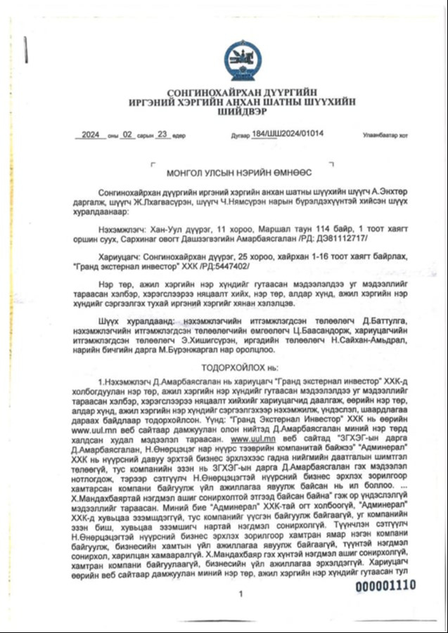 Авлигатай тэмцэх газар, Цагдаагийн Ерөнхий газар, Улсын бүртгэлийн ерөнхий газар, “Эрдэнэс Тавантолгой” ХХК бүгд шалгаад тогтоочихсон гэсэн үг. “Худлыг мянга давтахаар үнэн болдог” гэсэн үг бий. Тиймээс Д.Амарбаясгалан нэр төрөө сэргээлгэхээр хуулийн байгууллагад хандаж эхэлсэн бөгөөд “Гранд Экстернал Инвестер” ХХК-д харьяалагддаг “uul.mn” сайтыг Сонгинохайрхан дүүргийн Иргэний хэргийн шүүхэд өгчээ. Тус сайт “Д.Амарбаясгалан Н.Өнөрцэцэгтэй нүүрсний бизнес хийх зорилгоор хамтарсан компани байгуулсан, “Админерал” ХХК-д хувь эзэмшдэг, Х.Мандахбаяртай нэгдмэл ашиг сонирхолтой” гэх мэт мэдээлэл бичсэн ч шүүх дээр нотолж чадаагүй тул залруулга гаргаж, нэр төрийг нь сэргээх 184/ШШ2024/01014 тоот шийдвэр гарчээ. Д.Амарбаясгалан дан ганц uul.mn сайтыг ч бус, УИХ-ын гишүүн Б.Энхбаяр, Ерөнхий сайд Г.Занданшатарыг ч мөн шүүхэд өгч, нэр төрөө сэргээлгэх хүсэлтээ гаргаад байгаа.