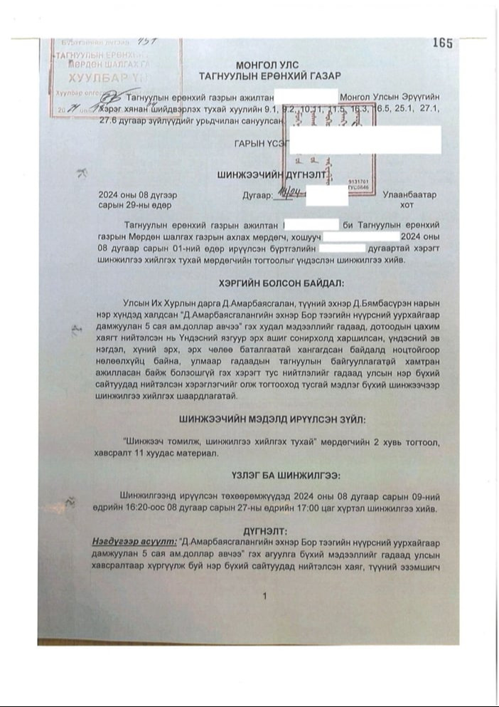 гомдлыг хүлээж авч, Тагнуулын Ерөнхий газар руу шилжүүлжээ. Тагнуулын Ерөнхий газар 2024 оны наймдугаар сарын 29-ний өдөр 12/24 тоот шинжээчийн дүгнэлт гаргасан байна. Тагнуулын Ерөнхий газрын шинжээчийн дүгнэлтэд “Д.Амарбаясгалангийн эхнэр Бор тээгийн нүүрсний уурхайгаар дамжуулан 5 сая ам.доллар авчээ” гэх агуулга бүхий мэдээллийг гадаад улсын нэр бүхий сайтуудаар дамжуулан нийтэлсэн. Мэдээлэл нийт 16 сайтад гарсан бөгөөд устгасан байна. “Asian Pulse” сайт нь WorldPress гэх бэлэн вэб сайт хийдэг загвар ашиглаж хийсэн байна. Албан ёсны хаяггүй, хуурамч сайт байх магадлалтай. “Crimedoor” сайт мөн албан ёсны хаяг, утасгүй сайт байна гэсэн дүгнэлт гаргажээ.