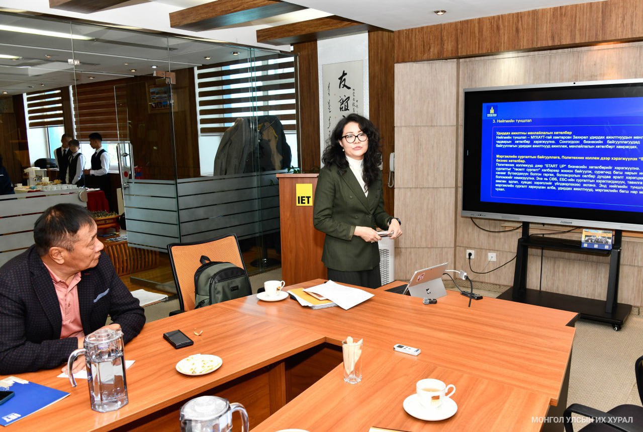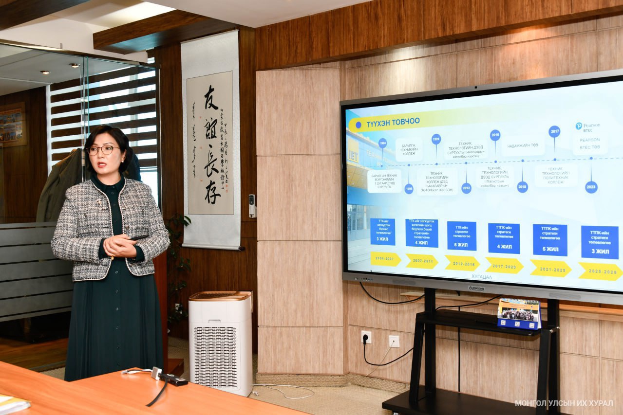 Уулзалтын эхэнд Боловсролын яамны Мэргэжлийн болон техникийн боловсролын газрын дарга Н.Нарангэрэл, Техник технологийн политехник коллежийн захирал Ц.Баярмаа нар салбарын болон коллежийн талаар танилцуулав. Бүсчилсэн хөгжлийн үзэл баримтлалын дагуу Хангайн, Баруун, Хойд, Төвийн, Зүүн болон Говийн бүс, Улаанбаатарын мэргэжлийн болон техникийн боловсрол, сургалтын байгууллагуудыг бүсийн онцлогттой уялдуулан, төрөлжүүлж байгаа аж. Хөдөлмөрийн зах зээлийн эрэлтэд нийцүүлэн, ажиллангаа суралцах боломжийг нэмэгдүүлэх үүднээс танхимын болон ажлын байрны хосмог сургалтыг өргөжүүлэхэд Боловсролын яам түлхүү анхаарал хандуулж байна. Энэхүү хосмог сургалтыг хэрэгжүүлж буй сургуулиудын нэг нь Техник технологийн политехник коллеж юм. Техник технологийн их сургууль болж өргөжөөд байгаа тус коллеж мэргэжлийн болон техникийн боловсрол, бакалавр, магистрын хөтөлбөр бүхий шаталсан сургалттай бөгөөд Монгол Улсын Засгийн газраас зарласан төсөл, хөтөлбөрүүдэд санаачилгатай оролцохын зэрэгцээ АНУ-ын Төрийн департаментын Фулбрайтын эрдэмтэн, Германы Олон улсын хамтын ажиллагааны нийгэмлэгийн багш, мэргэжлийн боловсрол сургалтын магистрын, Японы “Дадлагажигч оюутан”, БНХАУ-ын оюутан, багш солилцооны зэрэг олон хөтөлбөр хэрэгжүүлж байна. Мөн дотоодын 360 гаруй аж ахуйн нэгж, байгууллагуудтай хамтран хосмог сургалтыг хөгжүүлэхийн зэрэгцээ англи хэлтэй инженер, цэргийн алба хаагчдыг мэргэшүүлэх, мэргэжил эзэмшүүлэх зэрэг төсөл, хөтөлбөрийг явуулдаг.