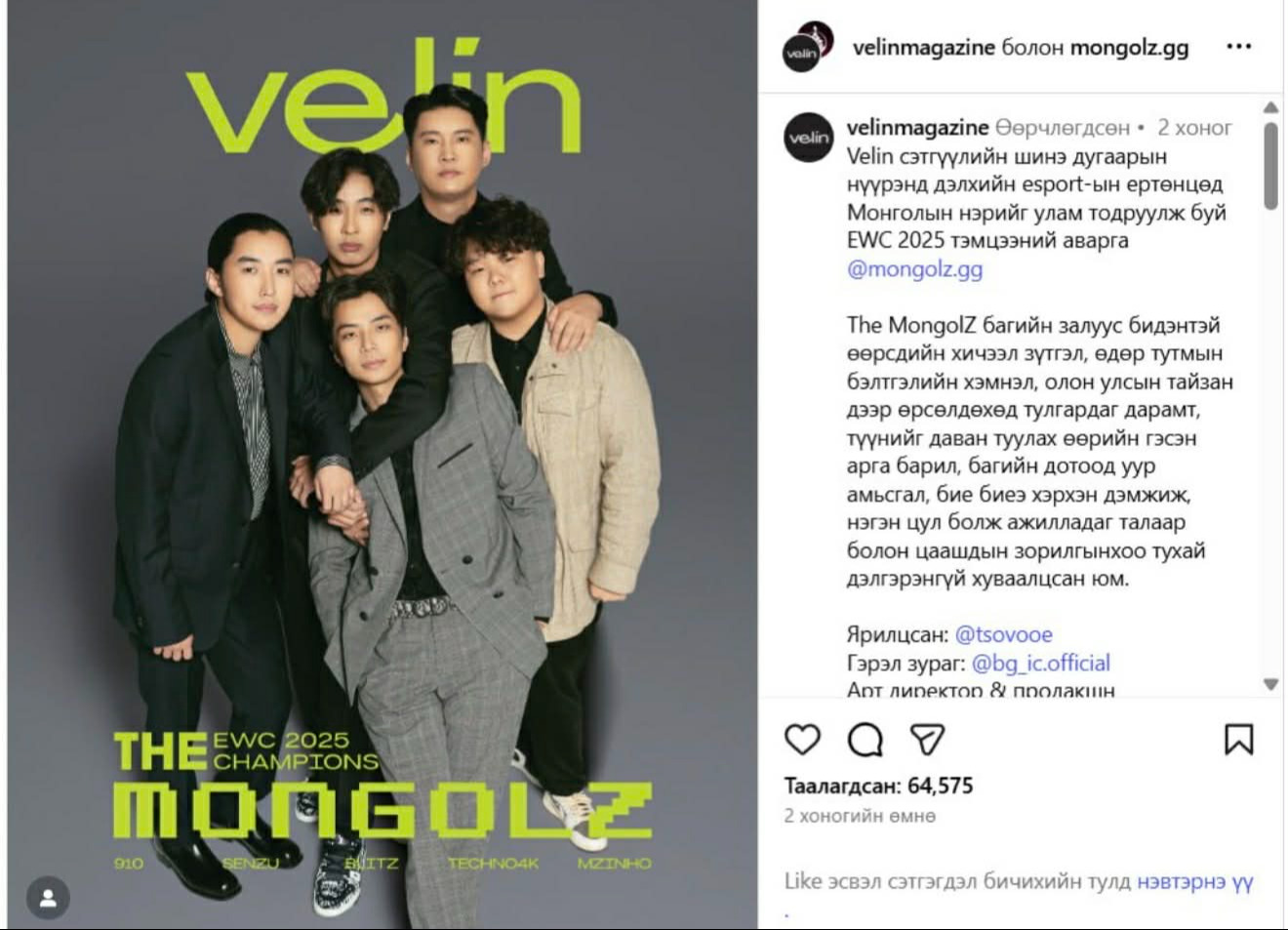 Монголын тэргүүлэгч esports баг болох The MongolZ загварын сэтгүүл Velin-ийн шинэ дугаарын нүүр хуудсанд гарахтай зэрэгцэн онцгой ярилцлага өглөө. Багийн тоглогчид болох Blitz буюу Б.Гарьдмагнай, Techno4k буюу М.Содбаяр, Mzinho буюу Б.Аюуш, 910 буюу Б.Өсөхбаяр, Senzu буюу Н.Азбаяр нар дэлхийн тайзнаа амжилтад хүрсэн нууц жороо хуваалцжээ.