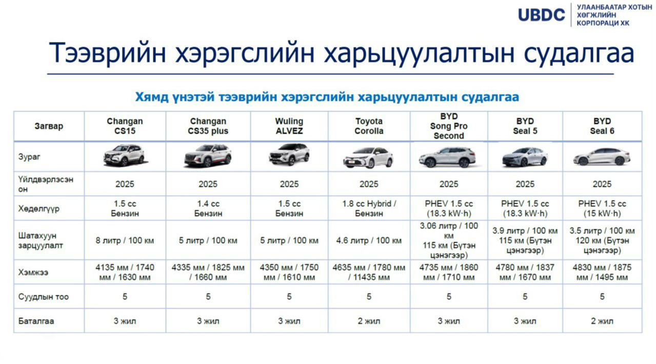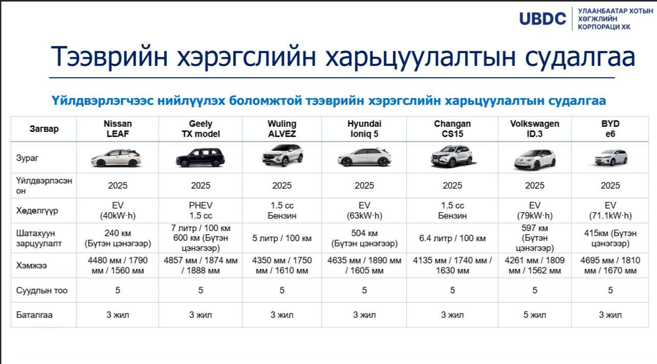Үүнд, Toyota, Hyundai, Kia, Nissan, Geely, Wuling, Changan, Volkswagen зэрэг дэлхийд тэргүүлэгч, байгальд ээлтэй, зорчиход тухтай үйлдвэрүүдийн машинаас хувийн хэвшлийн аж ахуйн нэгж өөрсдөө сонгож авах боломжтой” гэв.