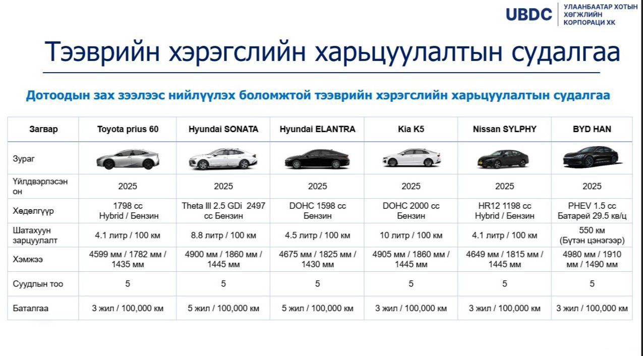 НЗДТГ-ын Хэвлэл мэдээлэл, олон нийттэй харилцах хэлтсээс тодруулахад “Зөвхөн хятад машин оруулж ирнэ гэдэг нь худал мэдээлэл. Такси үйлчилгээг сайжруулах төслийн ТЭЗҮ-д дэлхийн хотуудад такси үйлчилгээнд явж байгаа зорчигчид тухтай, байгаль орчинд ээлтэй 10 үйлдвэрийн төрөл бүрийн маркийн автомашинуудыг судалсан. Дараах 3 төрлөөр судалгаа хийсэн. Дотоодын зах зээлээс нийлүүлэх боломжтой тээврийн хэрэгсэл, үйлдвэрлэгчээс нийлүүлэх боломжтой тээврийн хэрэгсэл, хямд үнэтэй тээврийн хэрэгсэл гэсэн жагсаалтууд гарсан.