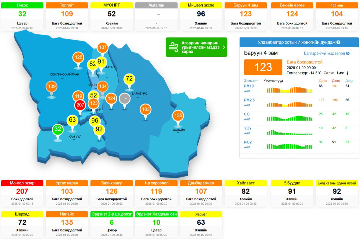 Улаанбаатар хотын агаарын чанарын индекс 10 цагийн хэмжилтээр Монгол газар орчимд 201 буюу бохирдолтой, Толгойт орчимд 109 буюу бага бохирдолтой байна. Энэ нь удаан хугацаагаар гадаа байхад хүний эрүүл мэндэд мэдэгдэхүйц сөрөг нөлөөлөл үзүүлэх түвшин юм.