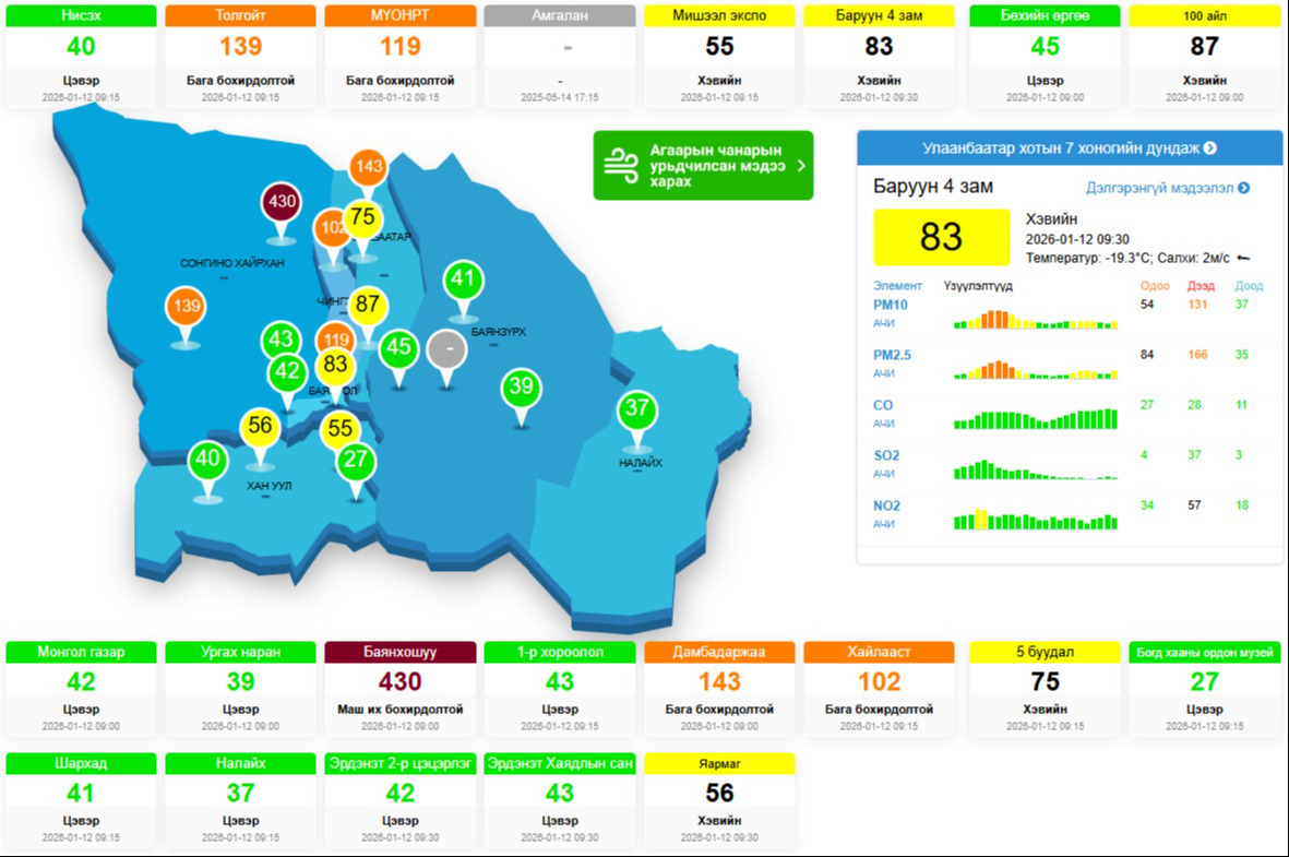 Улаанбаатар хотын агаарын чанарын индекс 10 цагийн хэмжилтээр Баянхошуу орчимд 430 буюу маш их бохирдолтой, Толгойт, Хайлааст орчимд 139 буюу бага бохирдолтой байна. Энэ нь удаан хугацаагаар гадаа байхад хүний эрүүл мэндэд мэдэгдэхүйц сөрөг нөлөөлөл үзүүлэх түвшин юм.